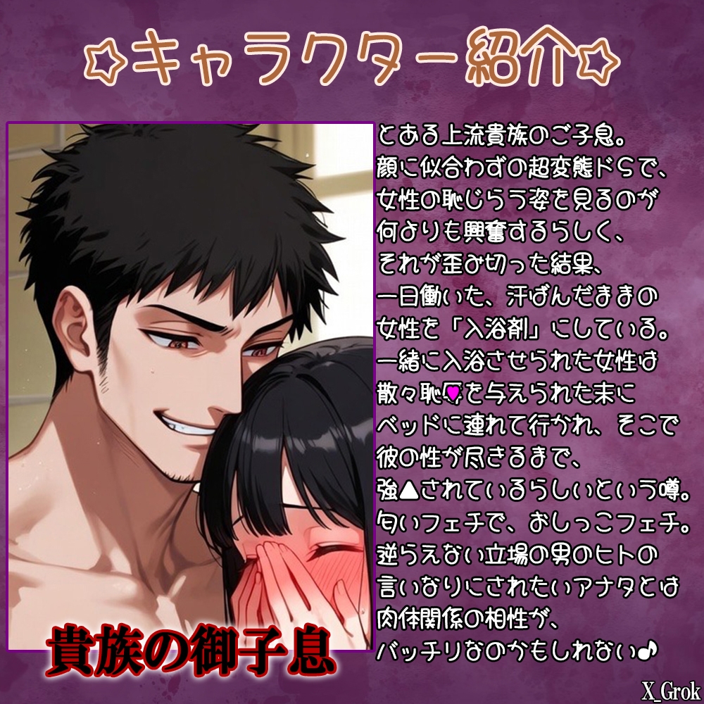 今日は、貴族の御子息様の命令で、彼の「入浴剤」となって奉仕するよう命じられちゃいました。はたして、アナタの運命は…?