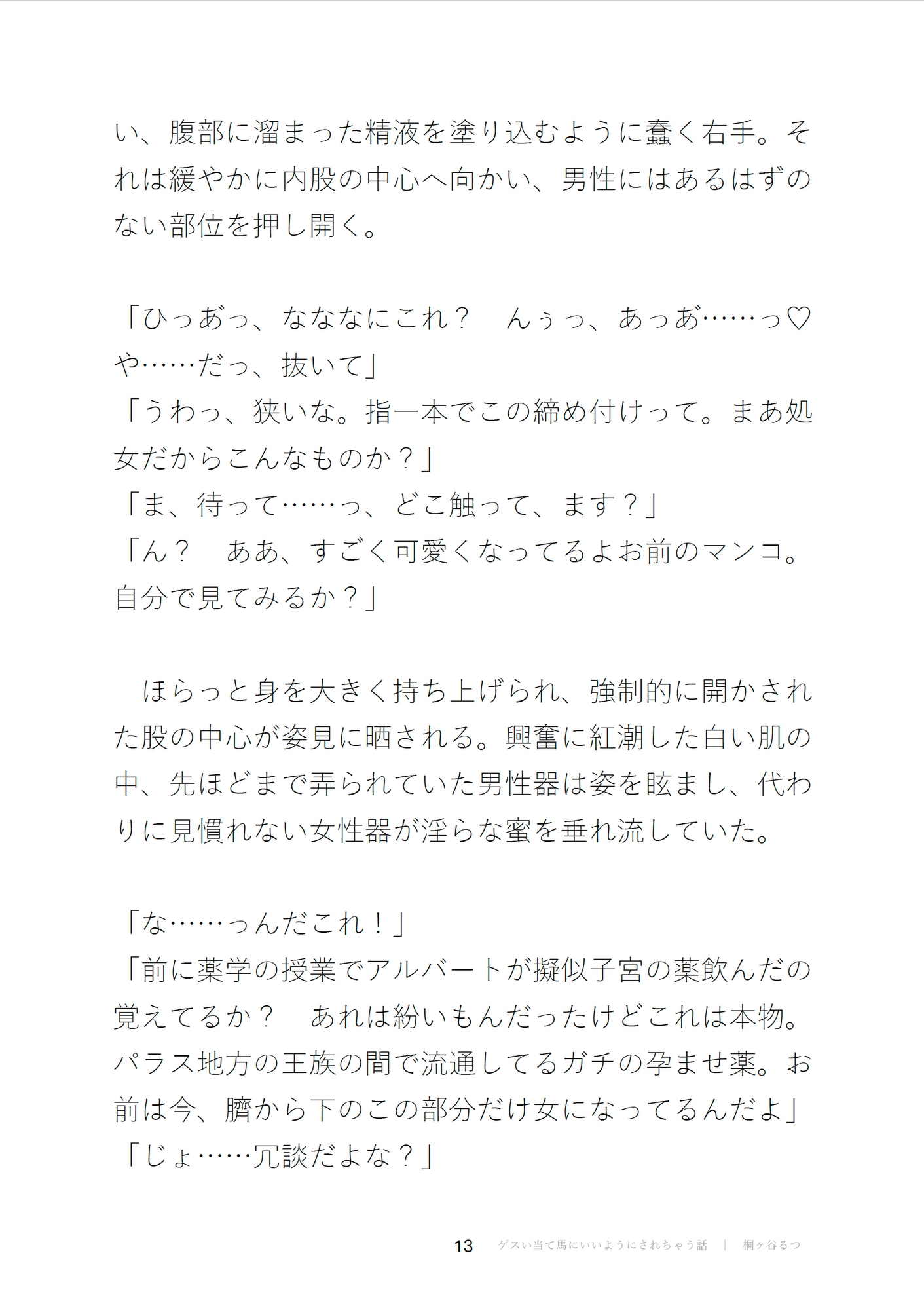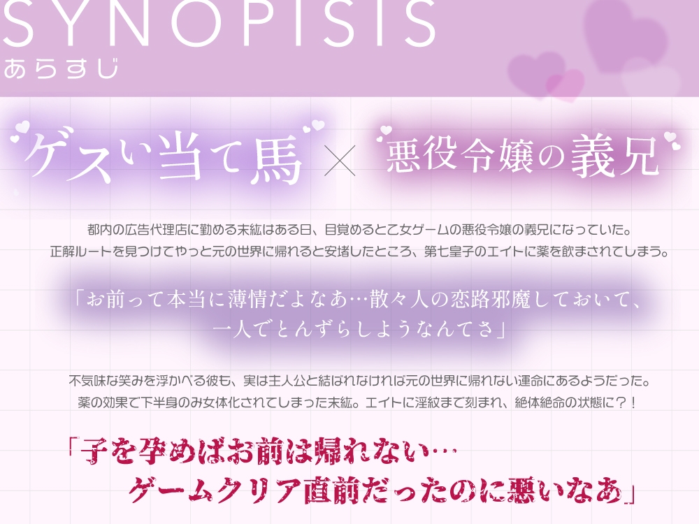 目覚めると乙女ゲームの悪役令嬢の義兄になっていた末紘。 正解ルートを引き当て、やっと元の世界に帰れると安堵したところ、第七王子のエイトに薬を飲まされてカン◯ボーイにされてしまう。「子を孕めばお前は帰れない…ゲームクリア直前だったのに悪いなあ」不気味な笑みを浮かべる彼も、主人公と結ばれなければ元の世界に帰れない運命にあった。 薬の効果で下半身は女体化、淫紋まで刻まれて絶体絶命の状態にーー?!