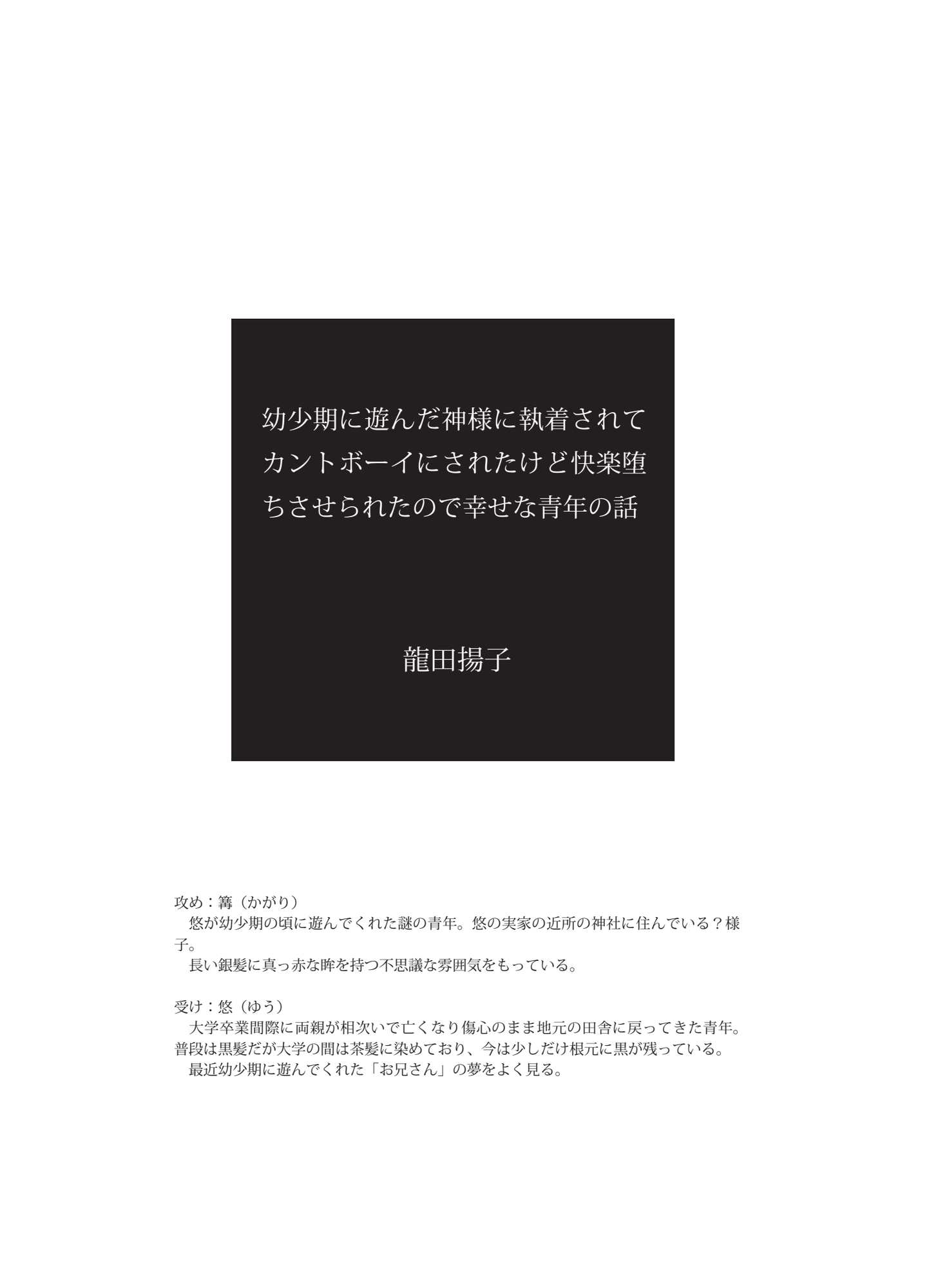 幼少期に遊んだ不思議なお兄さんは神様だった。彼はなぜか執着してきて、体も下半身だけ女の子になるカントボーイに変えられてしまい、手籠めにされてしまう。神様の与えてくる快楽に耐えきれず快楽堕ちしてしまい……