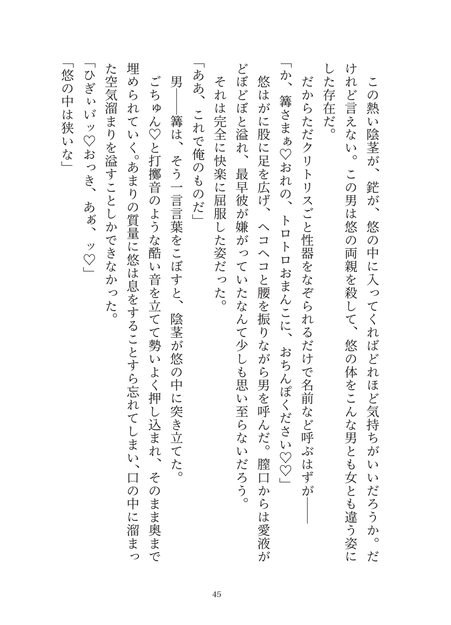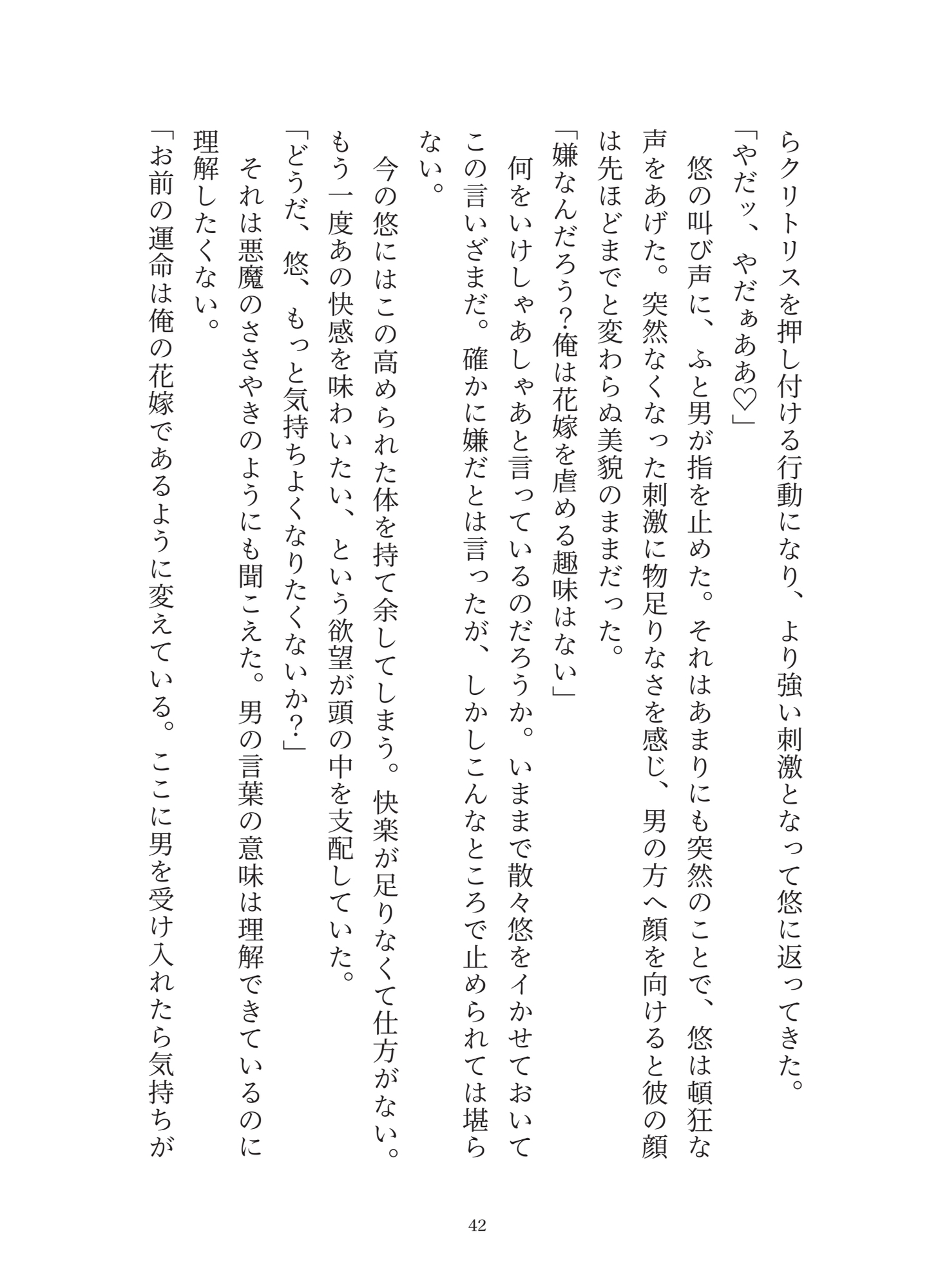 そんなことはできないと抵抗する悠の体は男によって下半身だけ女性にされてしまう。男の与える快楽に最初の内こそ抵抗するが、クリ責めをされていきついには快楽に屈してしまう──