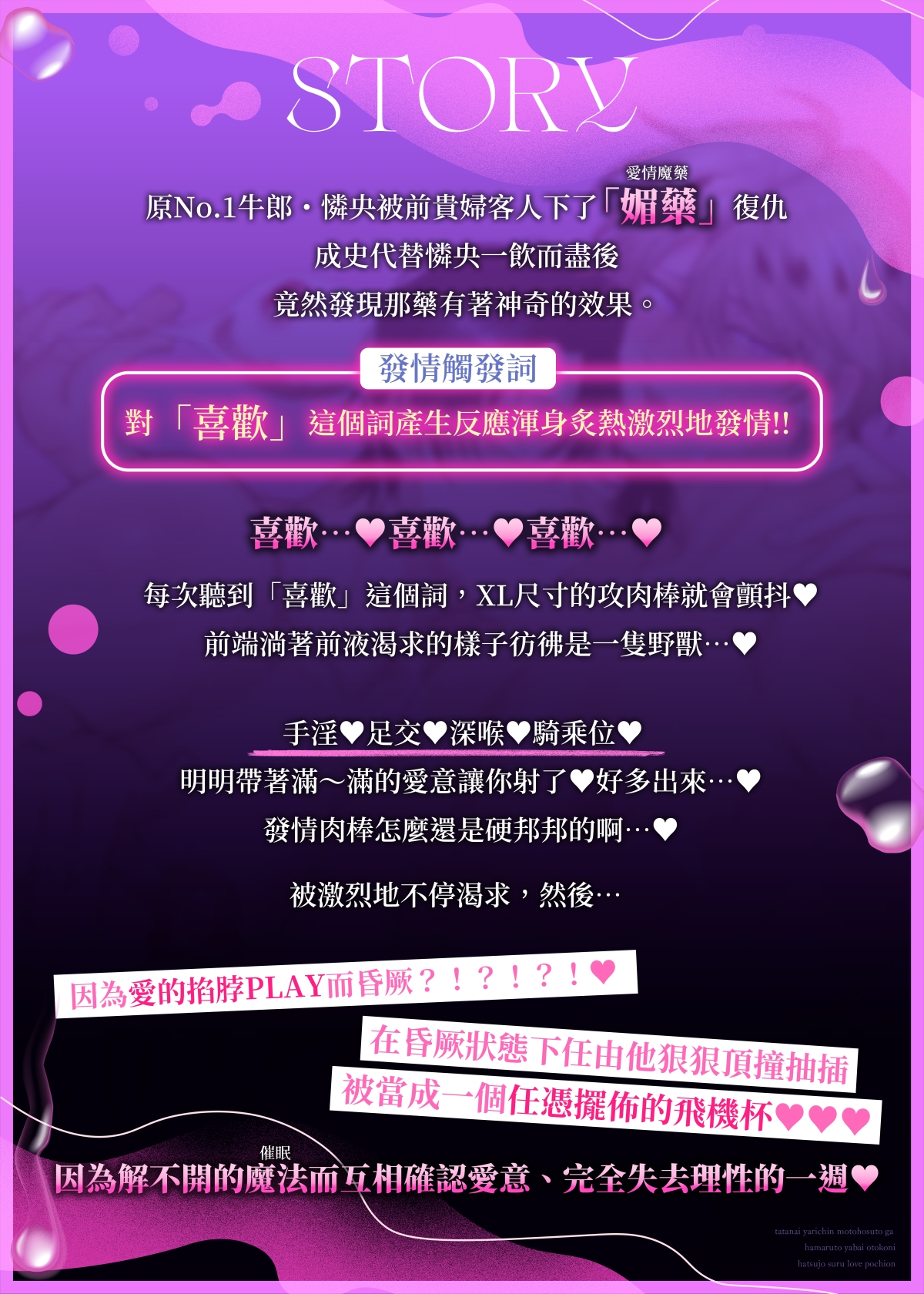 喜歡⋯♡喜歡⋯♡喜歡⋯♡每次聽到「喜歡」這個詞,XL尺寸的攻肉棒就會顫抖♡前端淌著前液渴求的樣子彷彿是一隻野獸⋯♡原No.1牛郎・憐央被前貴婦客人下了「愛情魔藥」復仇,成史代替憐央一飲而盡後,竟然發現那藥有著神奇的效果⋯⋯。因為解不開的催○而互相確認愛意、完全失去理性的一週♡