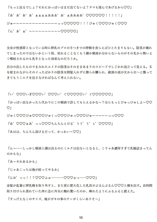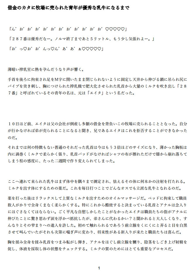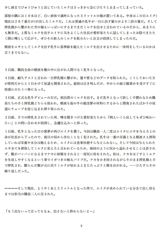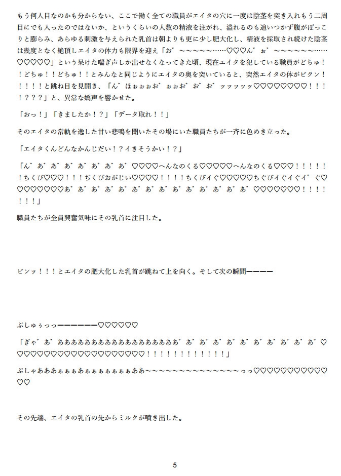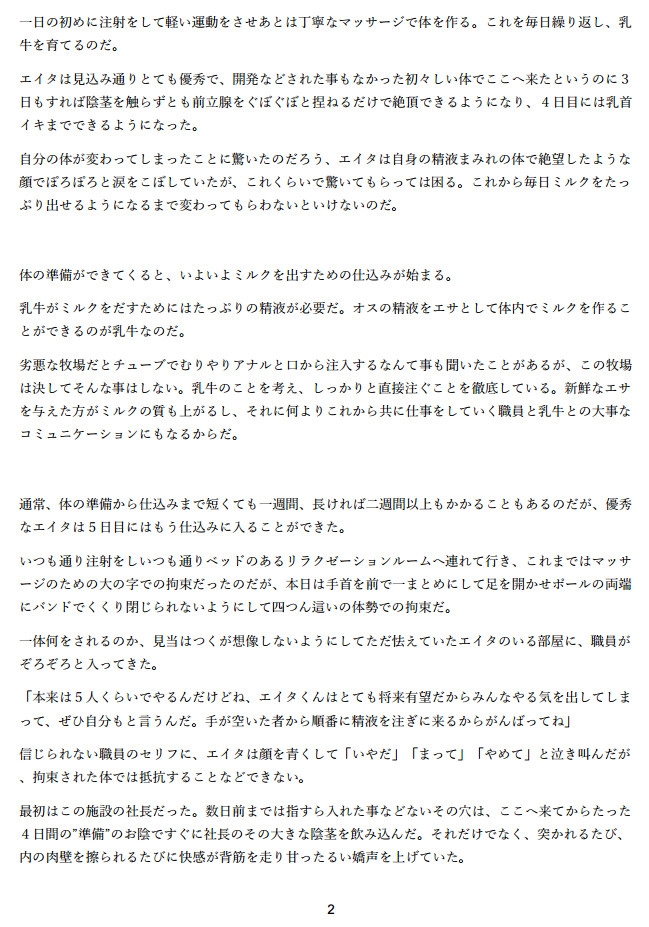乳首からミルクを出す体に作り変えられたエイタはミルクを絞られ精液を絞られ体を弄られ、その体はどんどん乳牛としての才能を開花させてゆく。