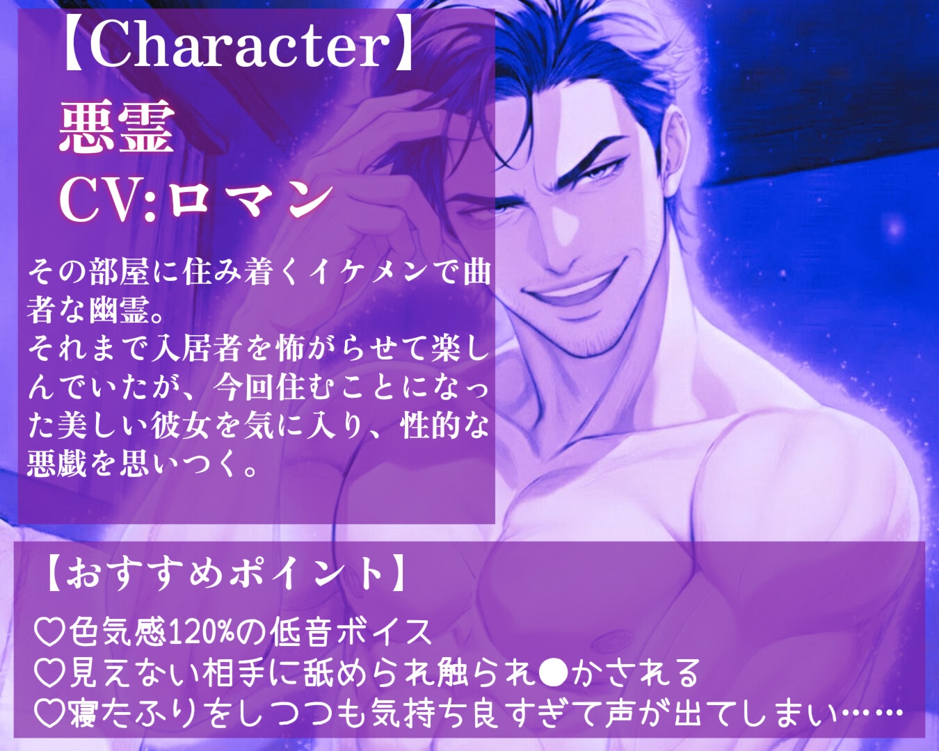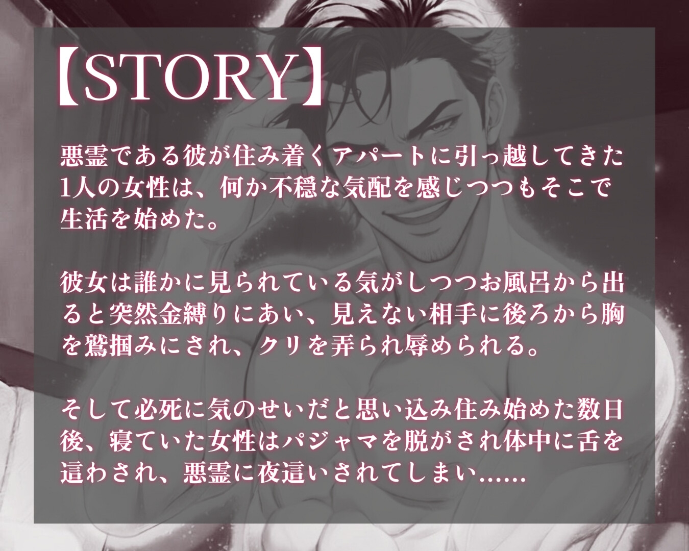 悪霊である彼が住み着くアパートに引っ越してきた1人の女性は、何か不穏な気配を感じつつもそこで生活を始めた。 彼女は誰かに見られている気がしつつお風呂から出ると突然金縛りにあい、見えない相手に後ろから胸を鷲掴みにされ、クリを弄られ辱められる。 そして必死に気のせいだと思い込み住み始めた数日後、寝ていた女性はパジャマを脱がされ体中に舌を這わされ、悪霊に夜○いされてしまい……