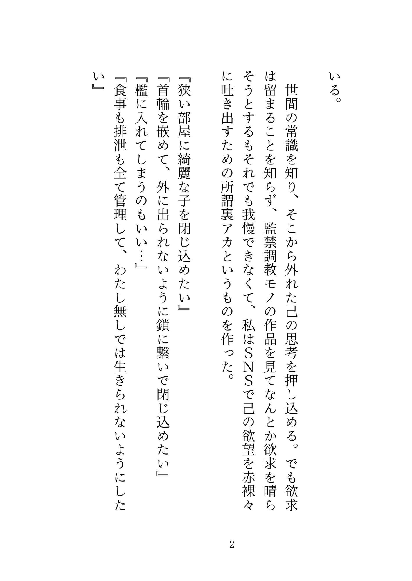 昔から閉じ込めたいという監禁願望が強く、大人になってもその欲が強かったので裏垢を始めた。