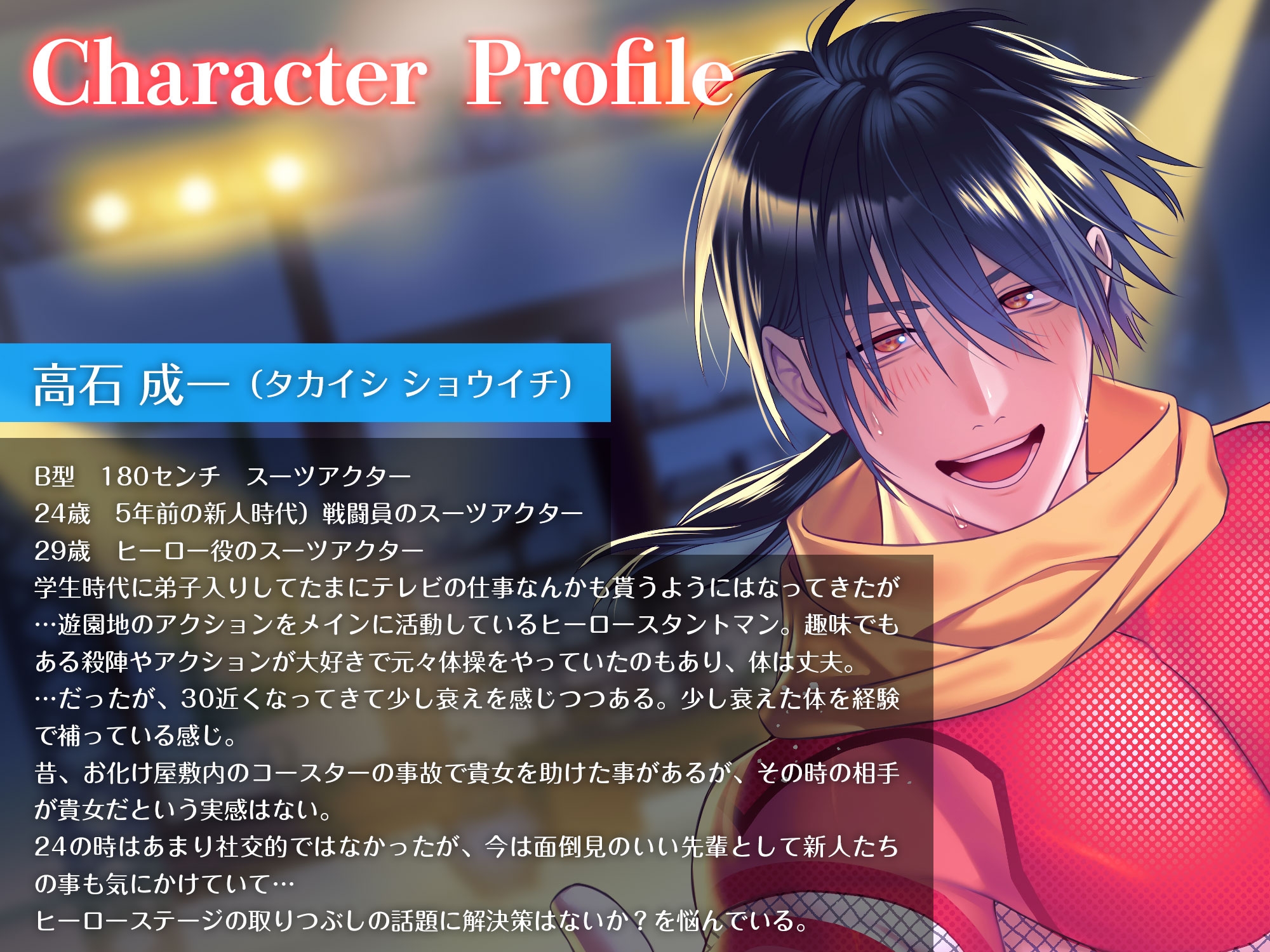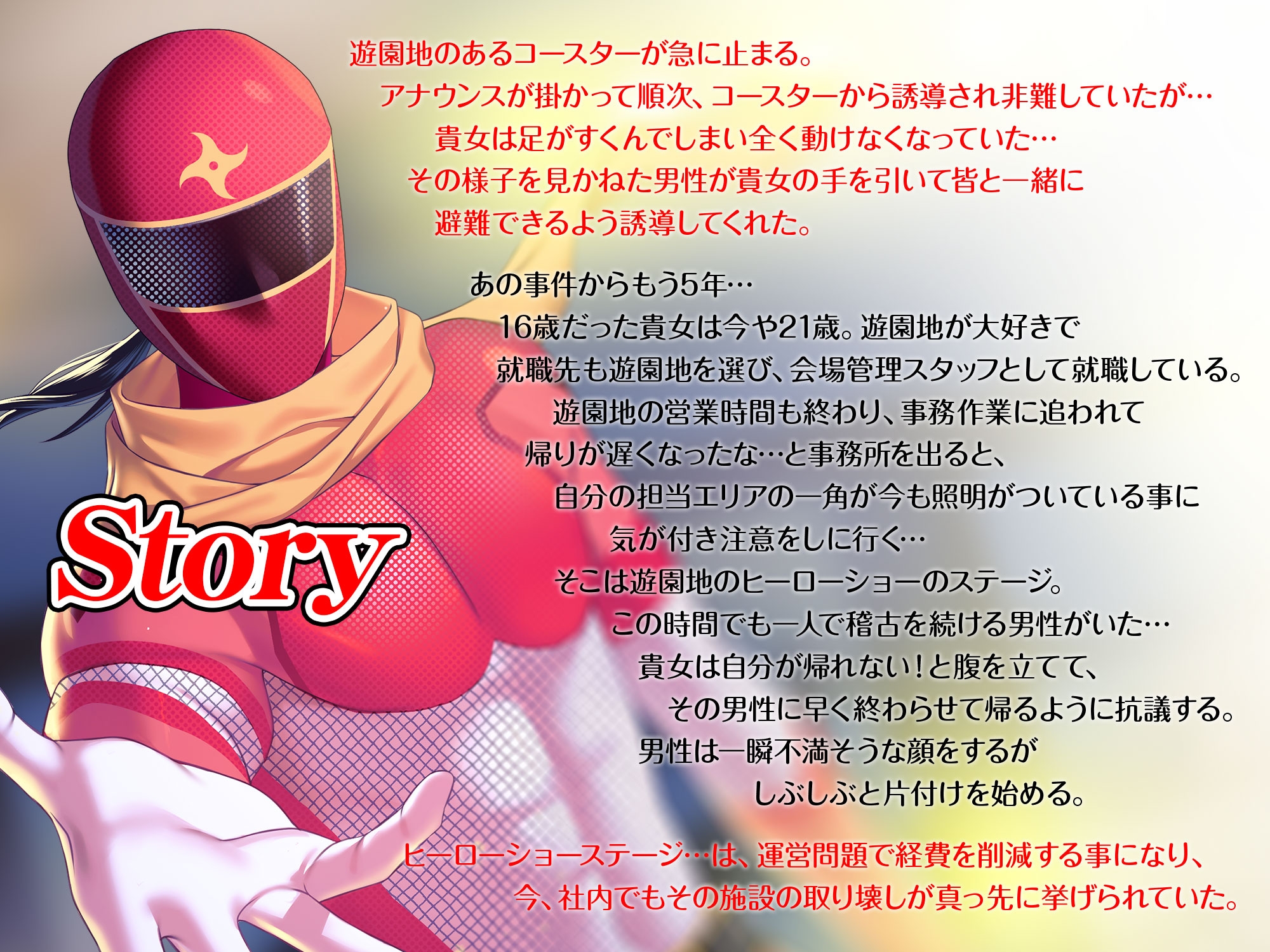 急に止まったコースター。足がすくんで動けない‥‥それ見かねた男性が助けてくれた。 あれから5年…貴女は21歳。遊園地が好きで遊園地に就職、会場管理スタッフとして働いている。 帰りが遅くなったな…と事務所を出ると担当エリアに照明がついていた…ヒーローショーのステージ。 注意をしに行くとそこにいた男性は一瞬不満な顔をするが素直に帰る。‥‥ヒーローショーステージは運営問題で経費を削減する事になり施設の取り壊しが議論されていた
