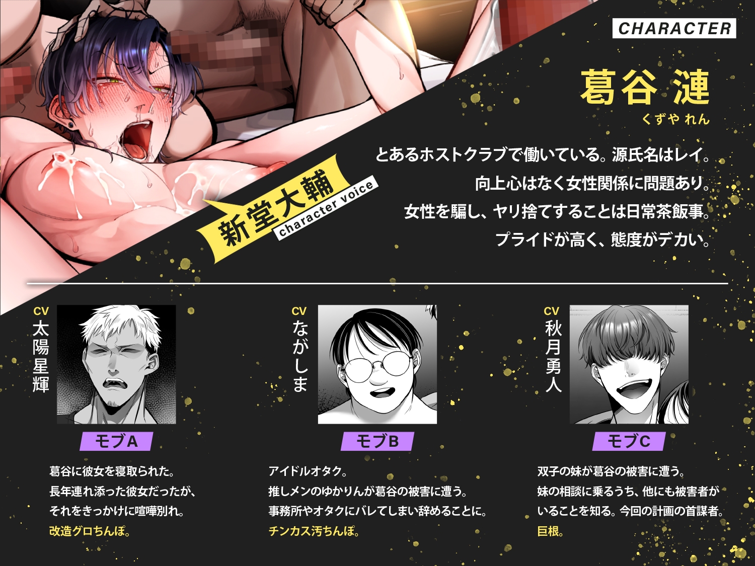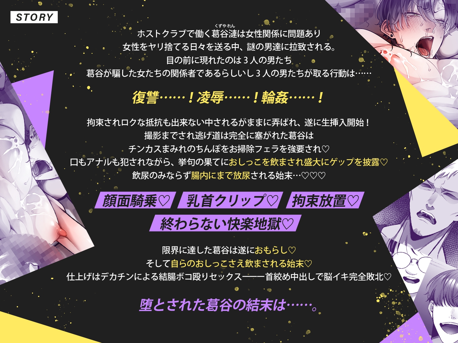 ホストクラブで働く葛谷 漣は女性関係に問題あり 女性をヤリ捨てる日々を送る中、謎の男達に拉致される。 目の前に現れたのは3人の男たち 拘束されロクな抵抗も出来ない中されるがままに弄ばれ、遂に生挿入開始! 撮影までされ逃げ道は完全に塞がれた葛谷の結末は……。