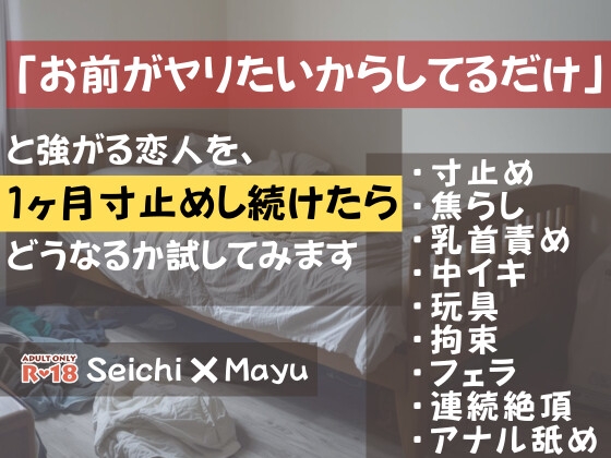 同じ大学に通う聖智と麻佑は、お互いの家に行き来する仲の恋人。しかし過度に体を重ねることに不満を持った麻佑は、聖智に向かって「お前がしたいからセックスをしているだけ」という発言をしてしまう。そこで聖智は、麻佑もしたがっていることを認めさせるため、あえてセックスを封じて焦らす作戦に出た。