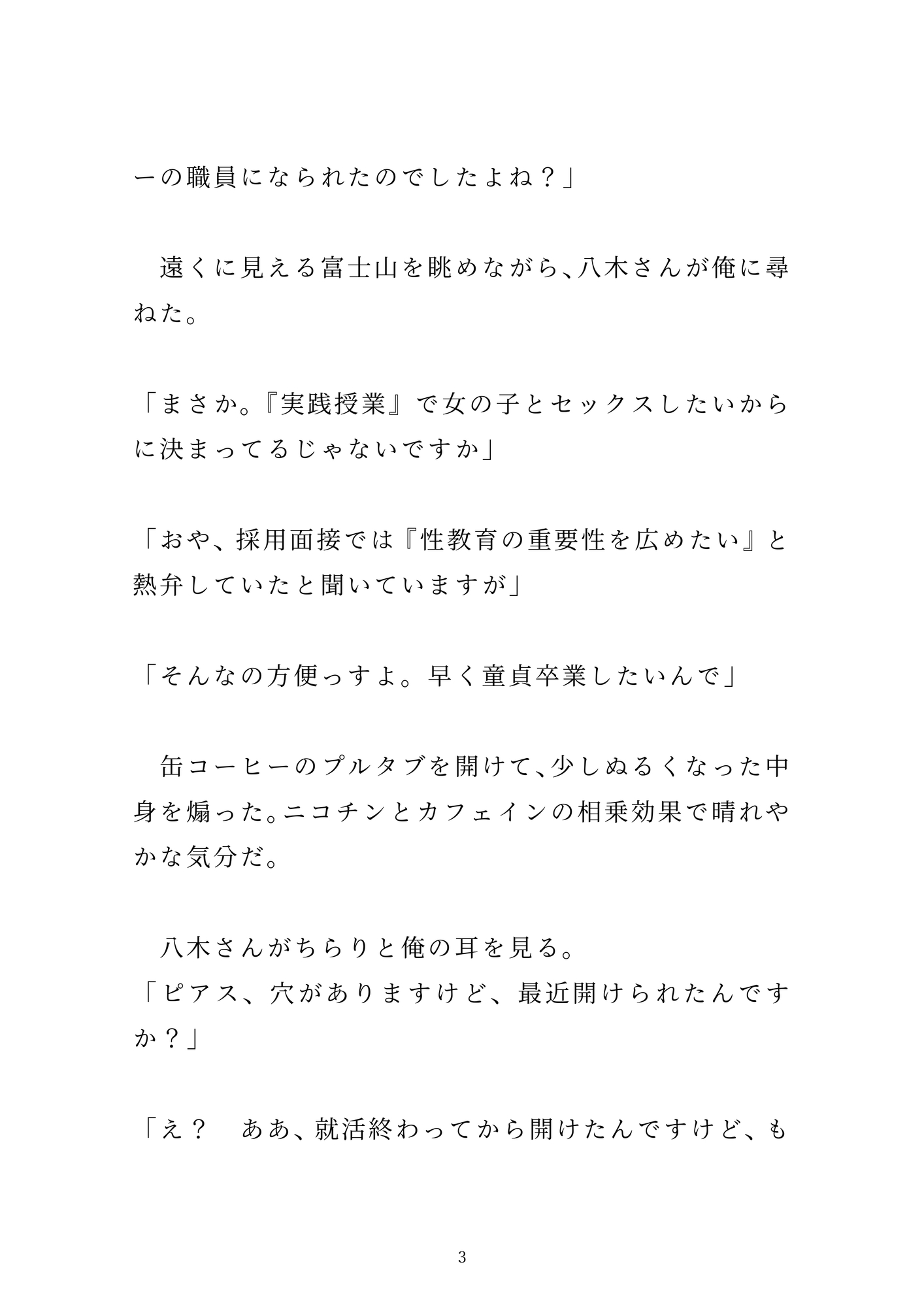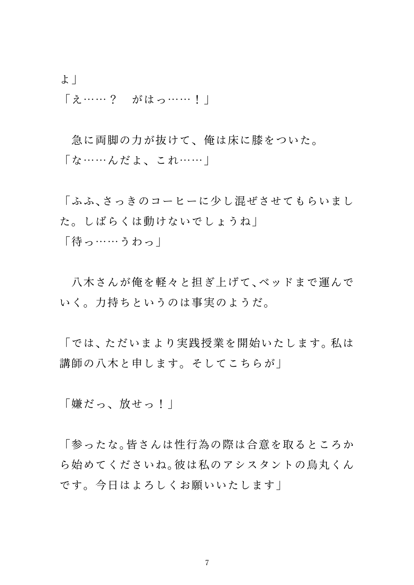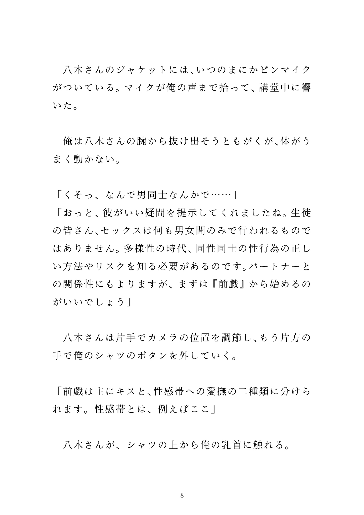 「女の子とのセックス」を夢見て新卒で「性教育センター」の職員になった烏丸。とある男子校での実践授業で、先輩男性職員の八木さんに一服盛られて、百名の生徒たちの前で公開セックスさせられる。 前戯から挿入まで手順通りにプレイを進める八木さんにとろとろにさせられる烏丸だったが、途中から八木さんが「ダメなセックスの例」を実践し始めて、激しすぎるプレイに何度も絶頂してしまう烏丸。快楽メス堕ちハッピーEND。