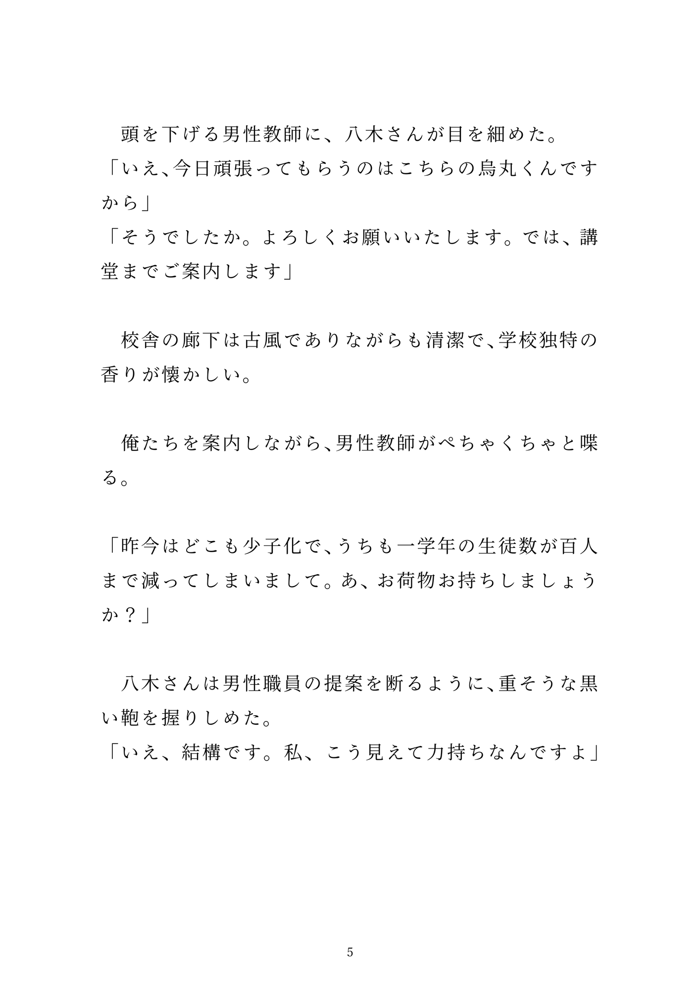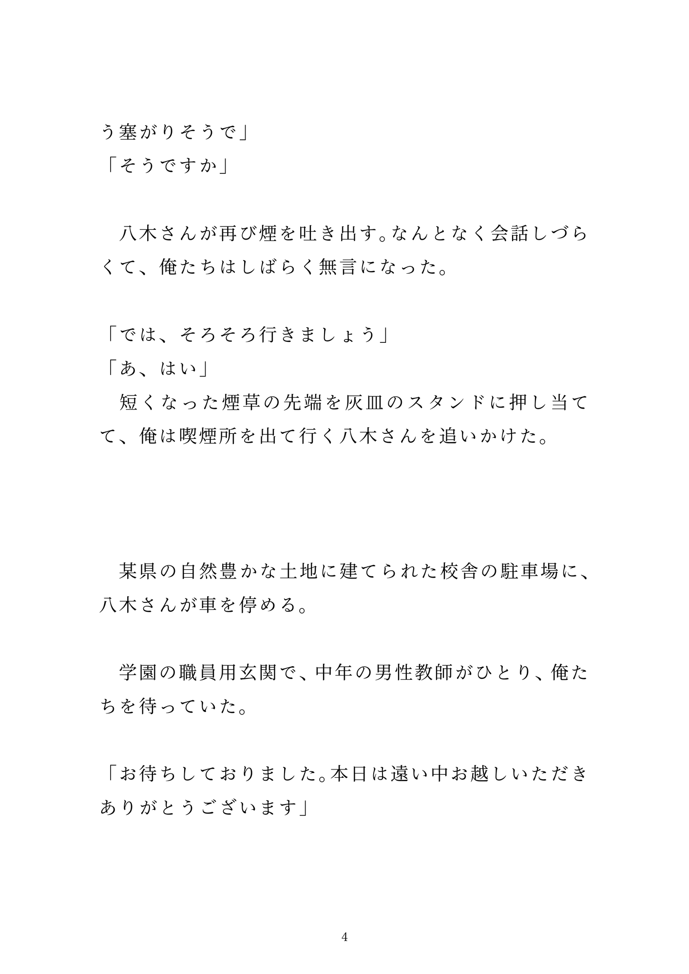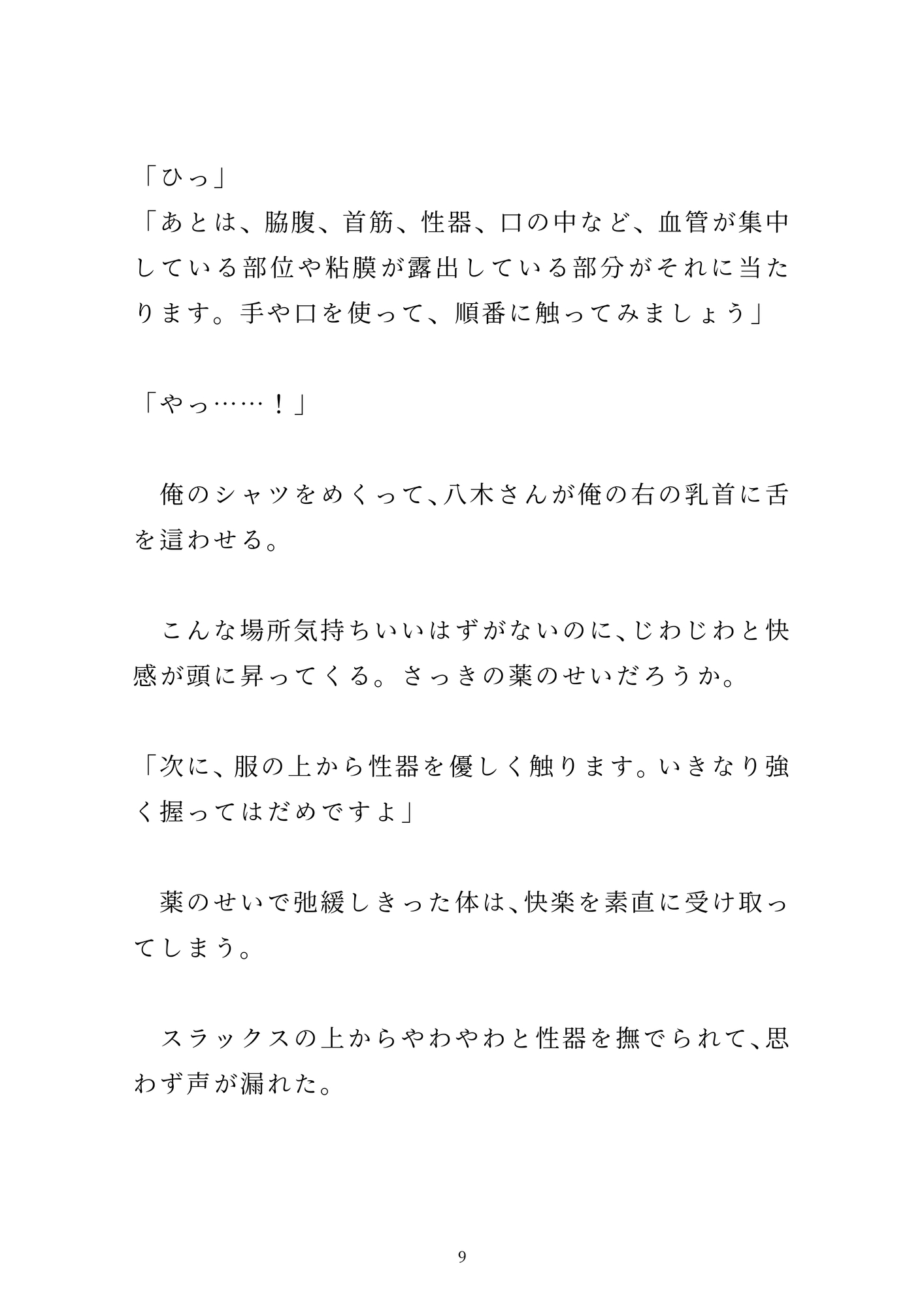 「女の子とのセックス」を夢見て新卒で「性教育センター」の職員になった烏丸。とある男子校での実践授業で、先輩男性職員の八木さんに一服盛られて、百名の生徒たちの前で公開セックスさせられる。 前戯から挿入まで手順通りにプレイを進める八木さんにとろとろにさせられる烏丸だったが、途中から八木さんが「ダメなセックスの例」を実践し始めて、激しすぎるプレイに何度も絶頂してしまう烏丸。快楽メス堕ちハッピーEND。