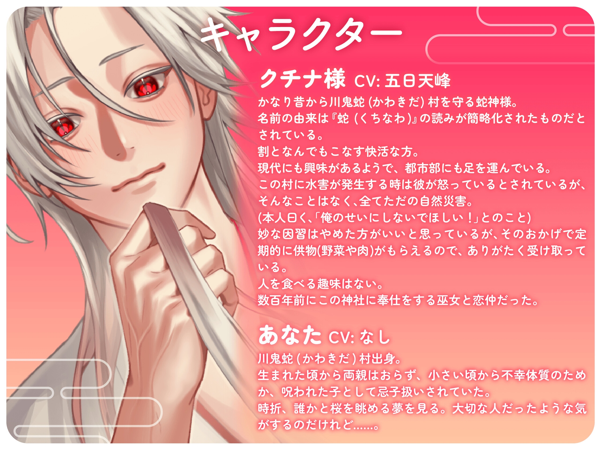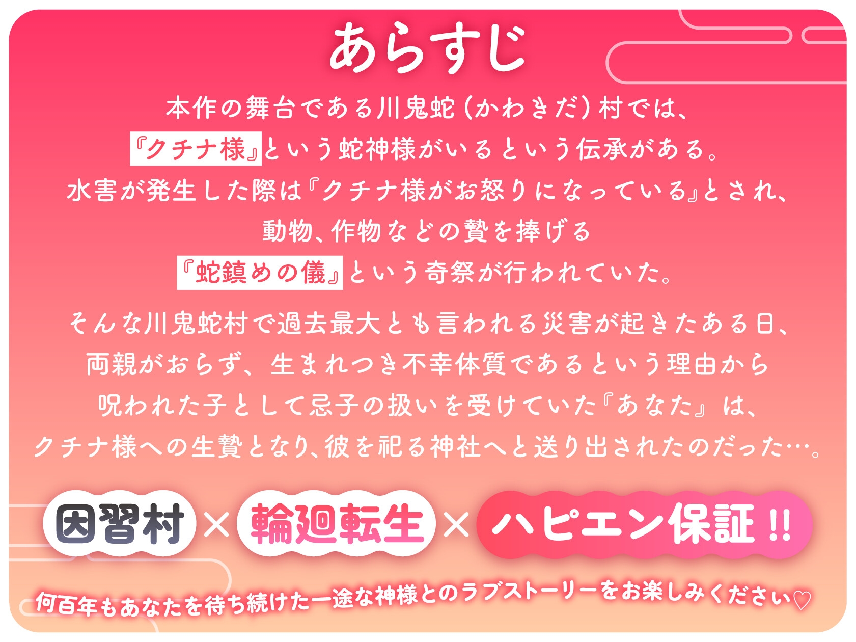 川鬼蛇(かわきだ)村では水害が起こる際は『クチナ様が怒っている』とされ、作物などの贄を奉納する『蛇鎮めの儀』という奇祭が行われていた。そんな因習村に生まれ、両親がおらず、不幸体質であることから忌子として虐げられていた『あなた』。川鬼蛇村で過去最大とも言われる災害が発生したある日、『あなた』はクチナ様への生贄として彼を祀る神社へ送り出され…?因習村×輪廻転生×ハピエン!一途な蛇神様とのラブストーリーです♡