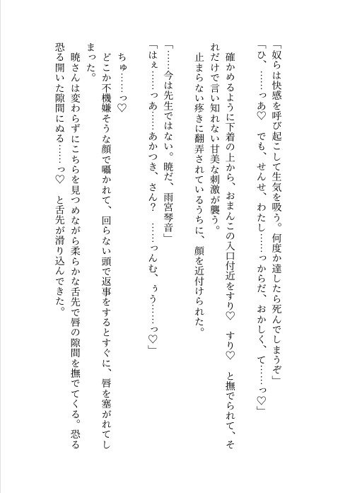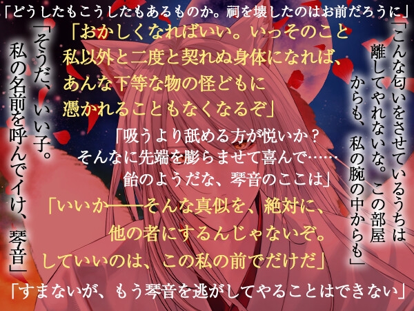 親友を救うため地元の祠を壊す決意をした琴音。道中、元担任でイケメンな憧れの数学教師・暁月先生と再会するものの、嘘をついて祠破壊を決行する。帰宅後、快楽で生気を奪う怪異に襲われる琴音の前に突然九尾のお狐様が現れた。実は暁月先生は村を守るため人間に化けていた九尾の狐“暁”だったらしい。そんなお狐様に、口の中に潜んでいた怪異をキスで吸われたり、おまんこの中まで入り込んでいた怪異を引きずり出されたりしてしまって……。