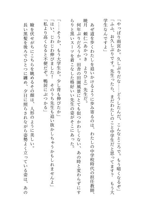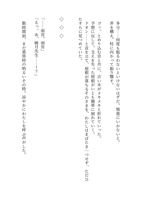 祠の怪異に魅入られて目を覚まさなくなってしまったいろはの代わりに自分が犠牲になろうと壊しに行く最中、中学時代のイケメンな数学教師、暁月先生に鉢合わせる。