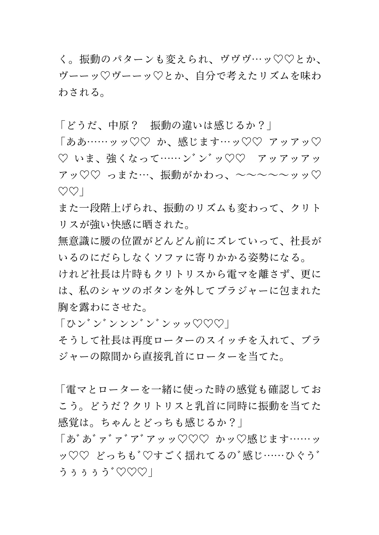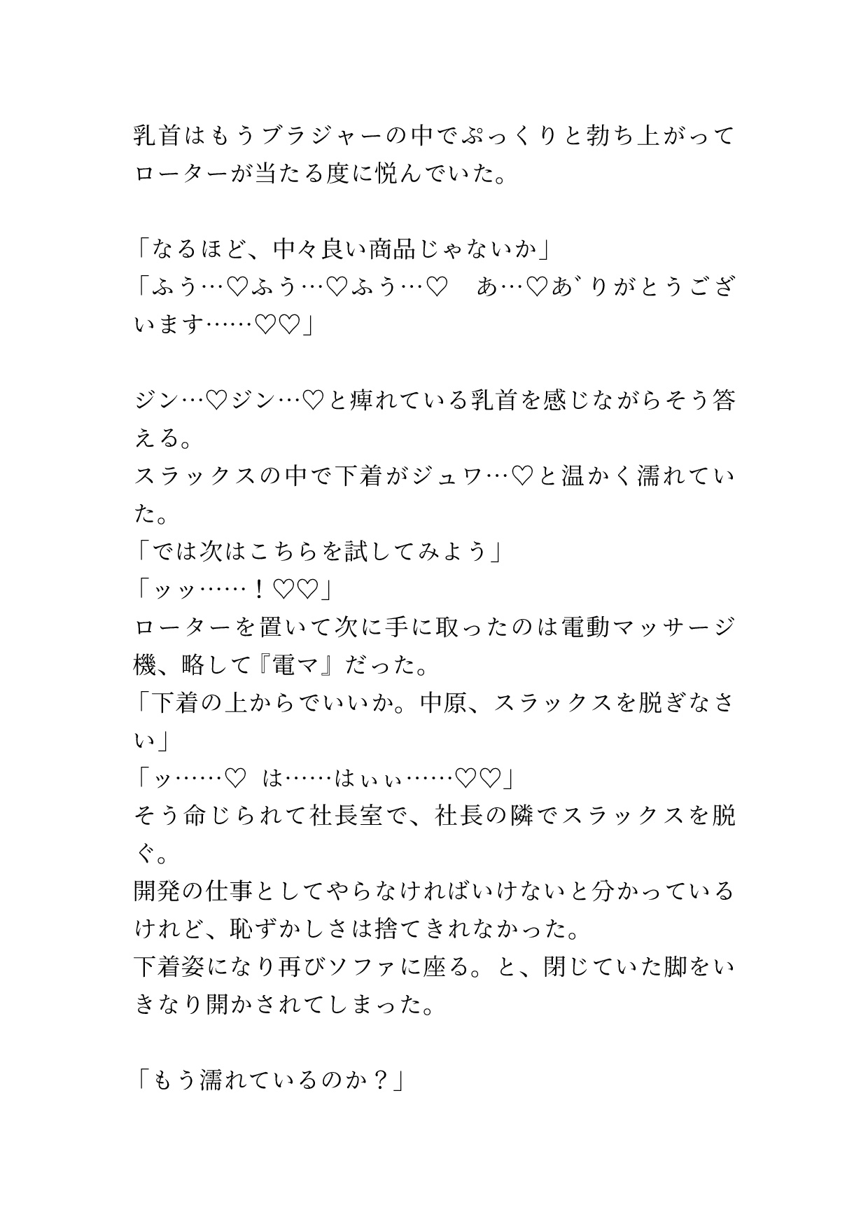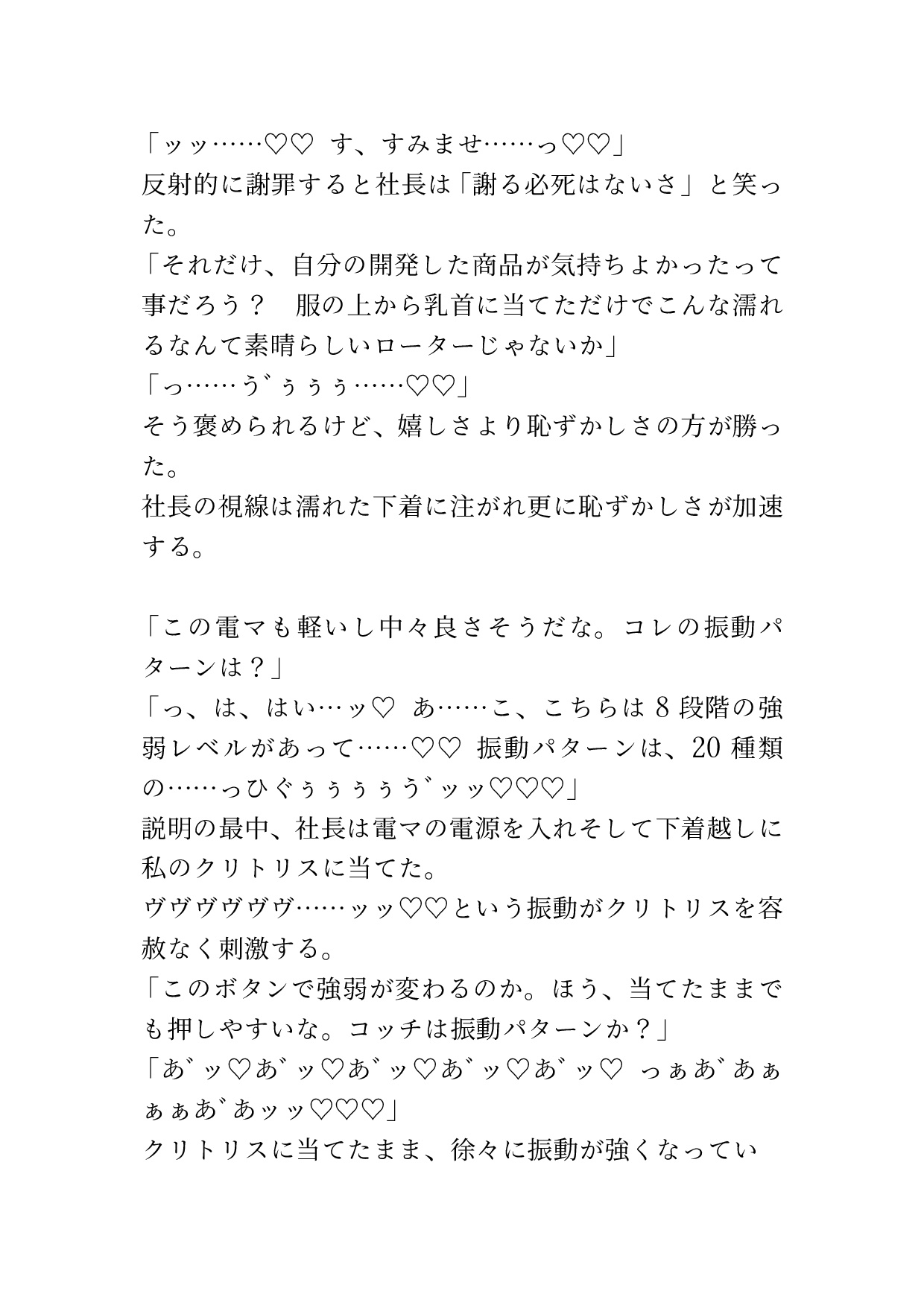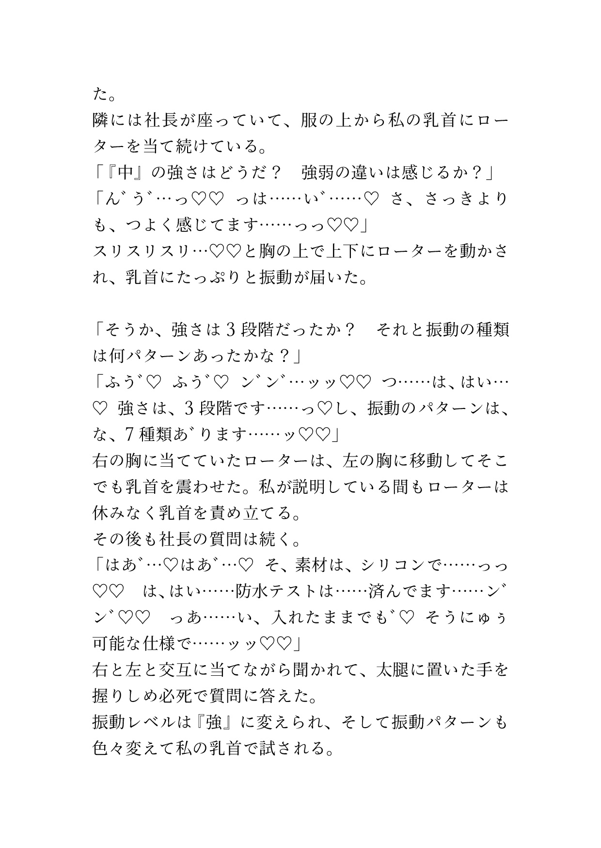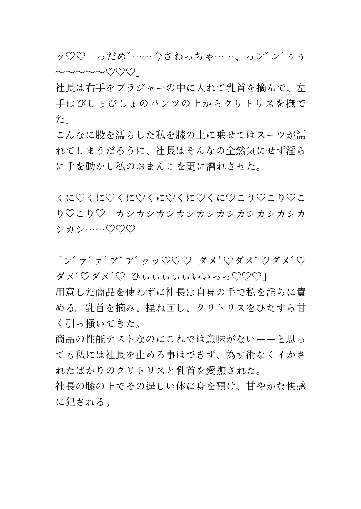 アダルトグッズを販売する会社の商品開発に勤める女性社員が、自分で考え開発した商品を社長と一緒に性能テストする話です。