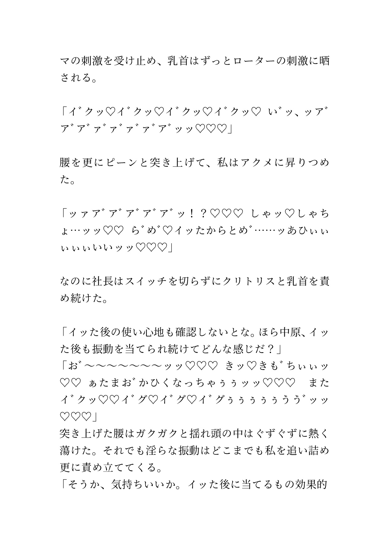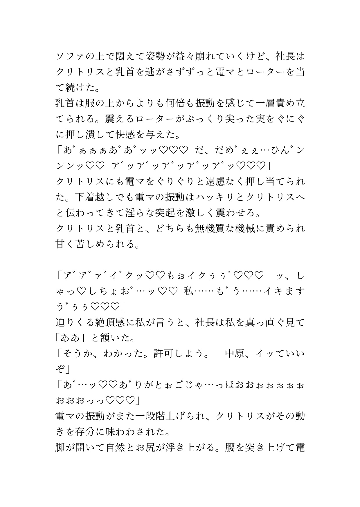 ローターで乳首を、電マでクリトリスを、バイブでおま○この中を社長にたっぷりと責められ、イかされ潮吹きなどもさせられた後、社長のチ○ポに中出しされます。