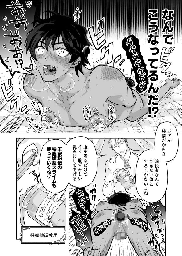 のけぞり絶頂で許しを乞いながらも暗殺者はやめないと言うジアに、ヴァイエルは怒って更に激しく調教するのだった。