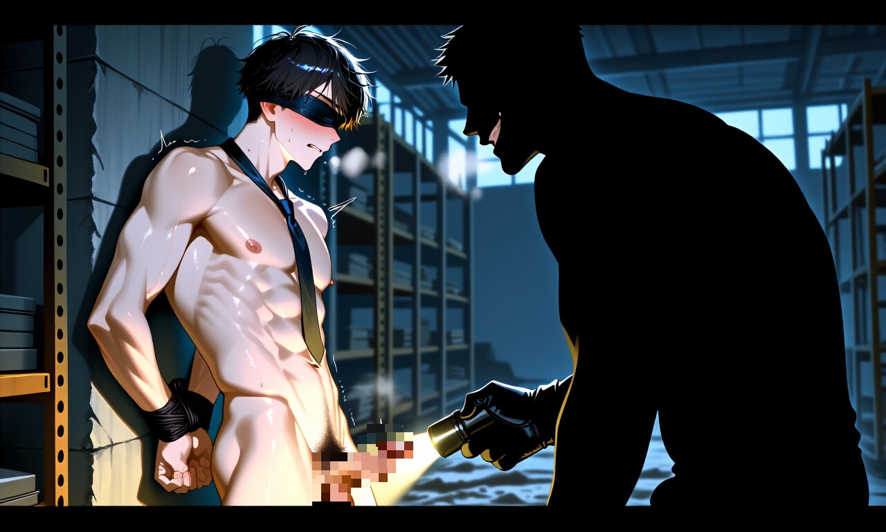 先輩警備員2人×夜勤の後輩。深夜の倉庫で目隠しされ、正体不明の二人組に五夜連続で犯される。そして明かされる、衝撃の正体。