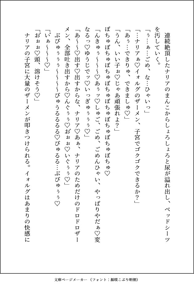 「このチャンスをものにせねば!!」とナリアは「飲めば相手が好きな人に見える」薬をイォルグに飲ませることに成功する。大好きなイォルグになんとか処女を貰ってもらおうと、必死にえっちなことを頑張り無事に処女をもらってもらうことにができた。