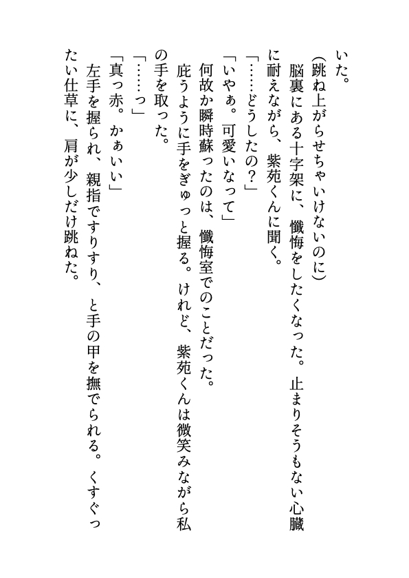 物語のフィクションとしてお楽しみください。お寺生まれのお嬢様である光本香乃(こうもと・かの)は、街の小さな教会でシスターとして働いてる。ある日、相談室として使われている懺悔室で相談役をしていたところ、やってきたのはヤクザの上条紫苑(かみじょう・しおん)。彼は中学時代の同級生で、香乃にとっての初恋だった。