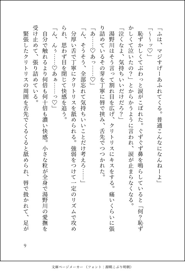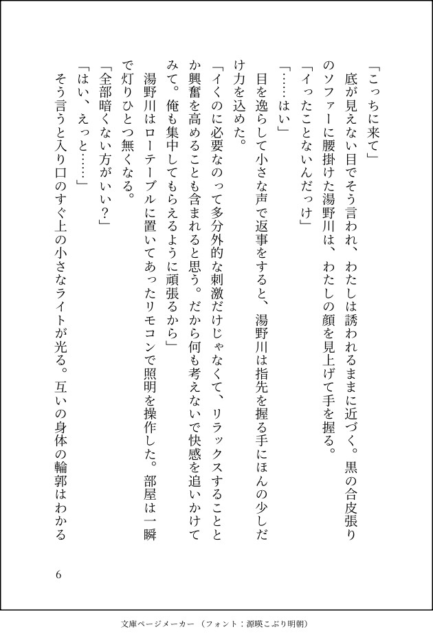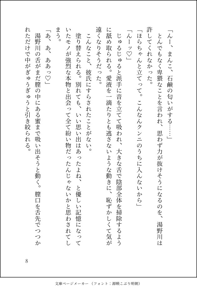 勢いで始まった関係だったが、彼の奉仕的なテクニックと徹底した気遣いにより、あなたは初めての絶頂を迎える。しかし関係が続くにつれ、舐め犬と主人の境界は曖昧になり、あなたは湯野川を好きになってしまう。「好きになると気を遣ってしまう」悪癖が発動し、濡れなくなってしまったあなた。