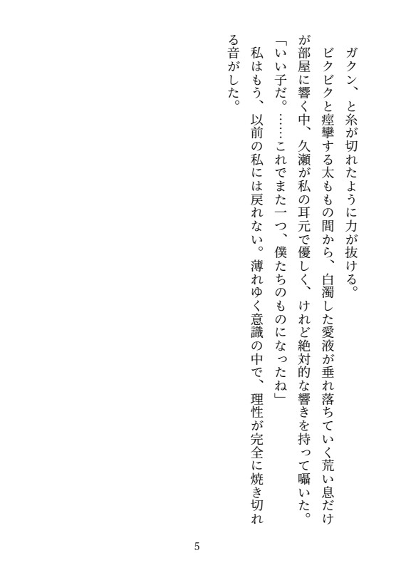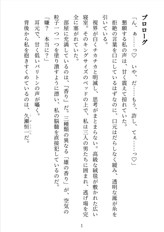 異常な嗅覚に苛まれるヒロインは、三人の雄が放つ濃厚な芳香の虜となる。彼ら専用の「器」として生きる契約を結んだ彼女を待っていたのは、三つの穴を同時に塞がれ、三度に渡り白濁で塗り潰される極限の蹂躙だった。理性が溶け、彼らの熱で内側から隙間なく満たされる快楽に悦びを感じる。逃げ場のない芳香の檻の中で、溢れる蜜に溺れながら幸せに絶望し依存していく、至高の執着愛。
