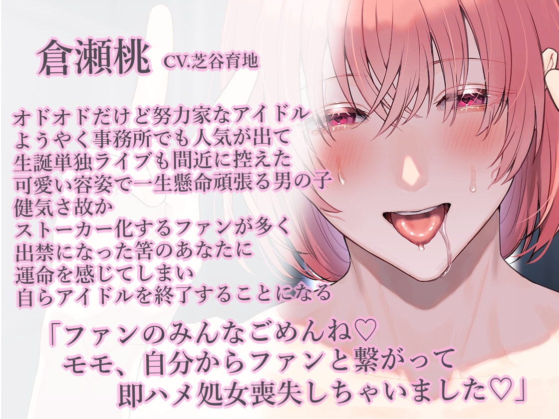 大好きな大好きなアイドルの桃くん。でも大好きすぎてストーカーとして出禁になっちゃったあなたは最後に桃くんと忘れられない思い出を作り、桃くんから自分を選んでもらえるおまじないを生誕ライブ練習終わりの桃くんにかける。アイドルが出しちゃいけない汚喘ぎでお外で全裸になってあなたのおちんぽを欲しがるド淫乱な桃くんとの甘いひとときと終わりのない快楽をお楽しみください。