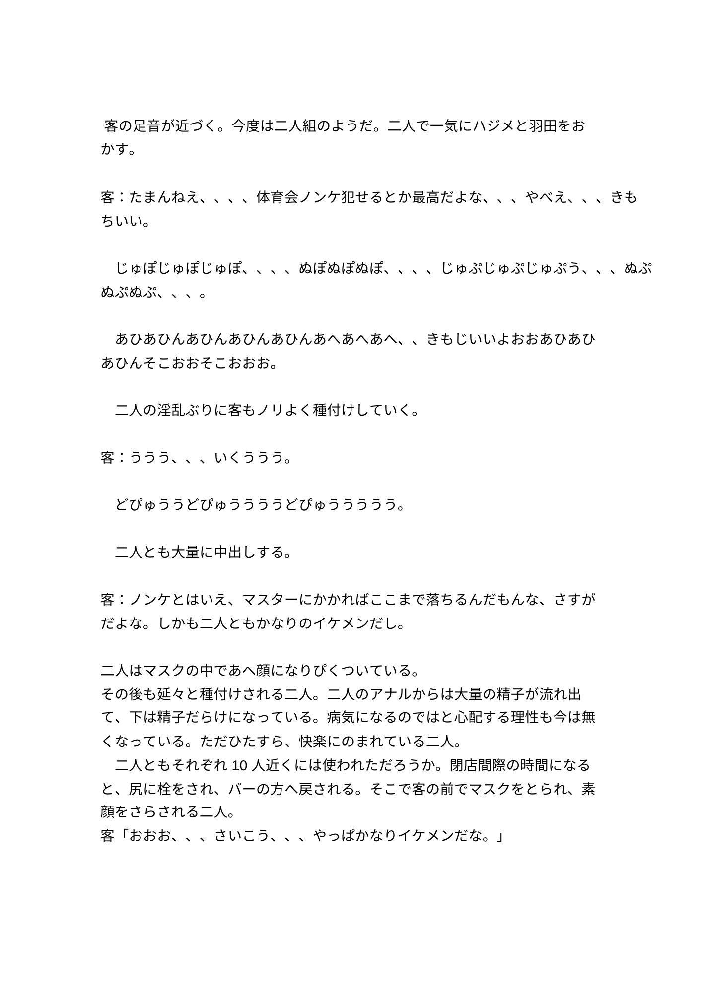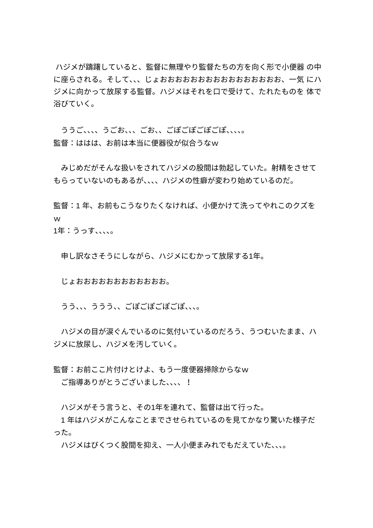 1に続きノンケの水泳部部長が鬼畜におとされていくBL小説です。 1で弱みを握られて、調教されるようになった水泳部部長がより多くの人の前で痴態をさらされ、まわされる展開となっています。 2では普通の性行為はもちろんのこと、ブレスコントロール、軽スカ、晒し、お仕置き、羞恥芸、罰ゲーム、壁尻輪○、バキュームベット、小便浣腸等様々なフェチプレイも取り入れてみました。