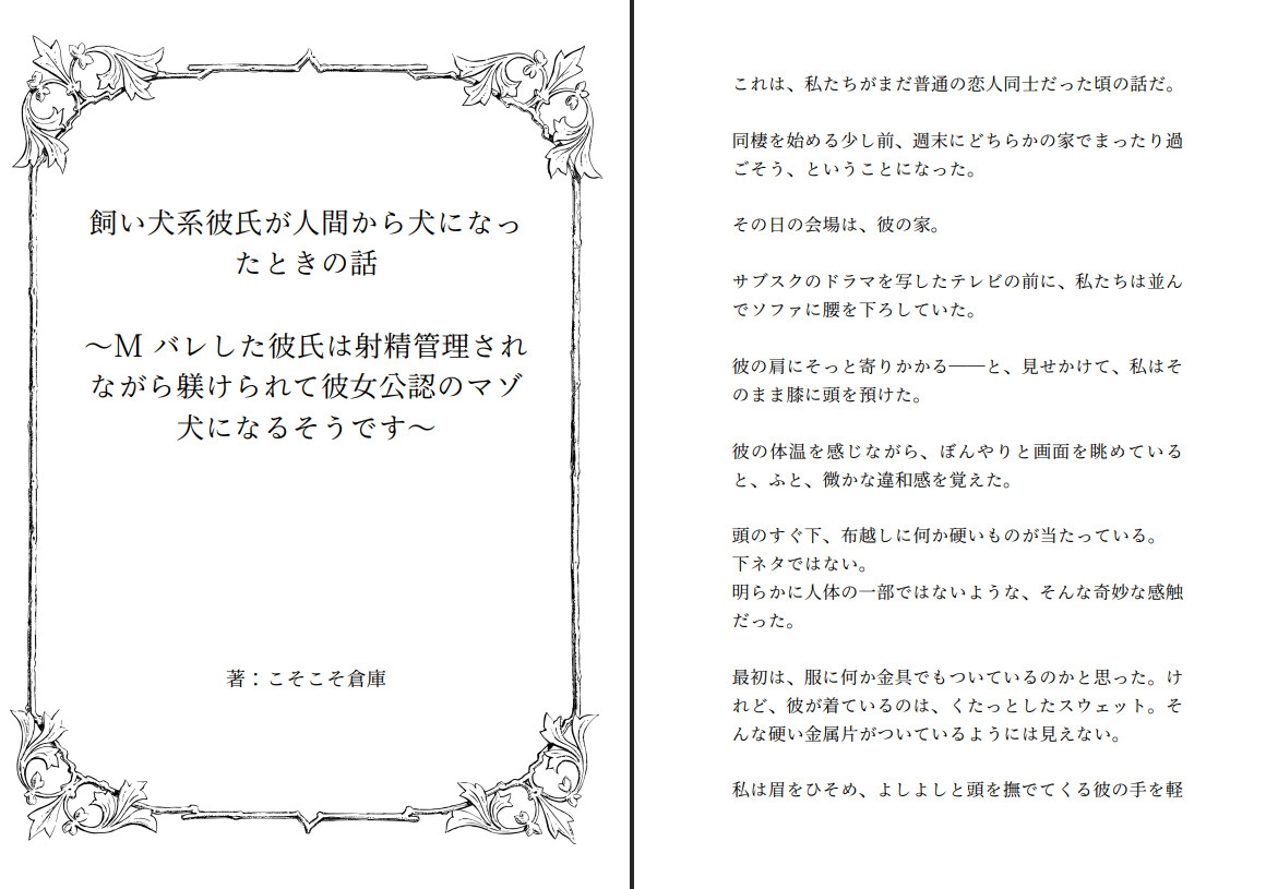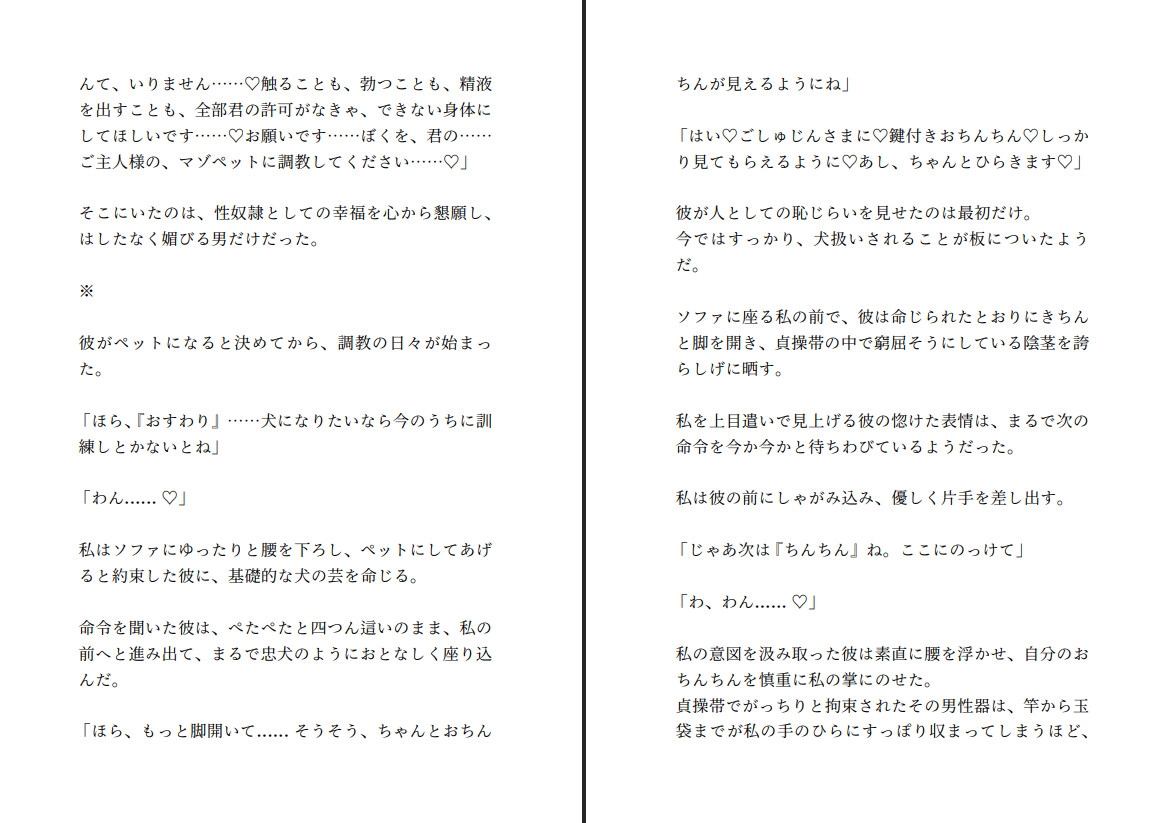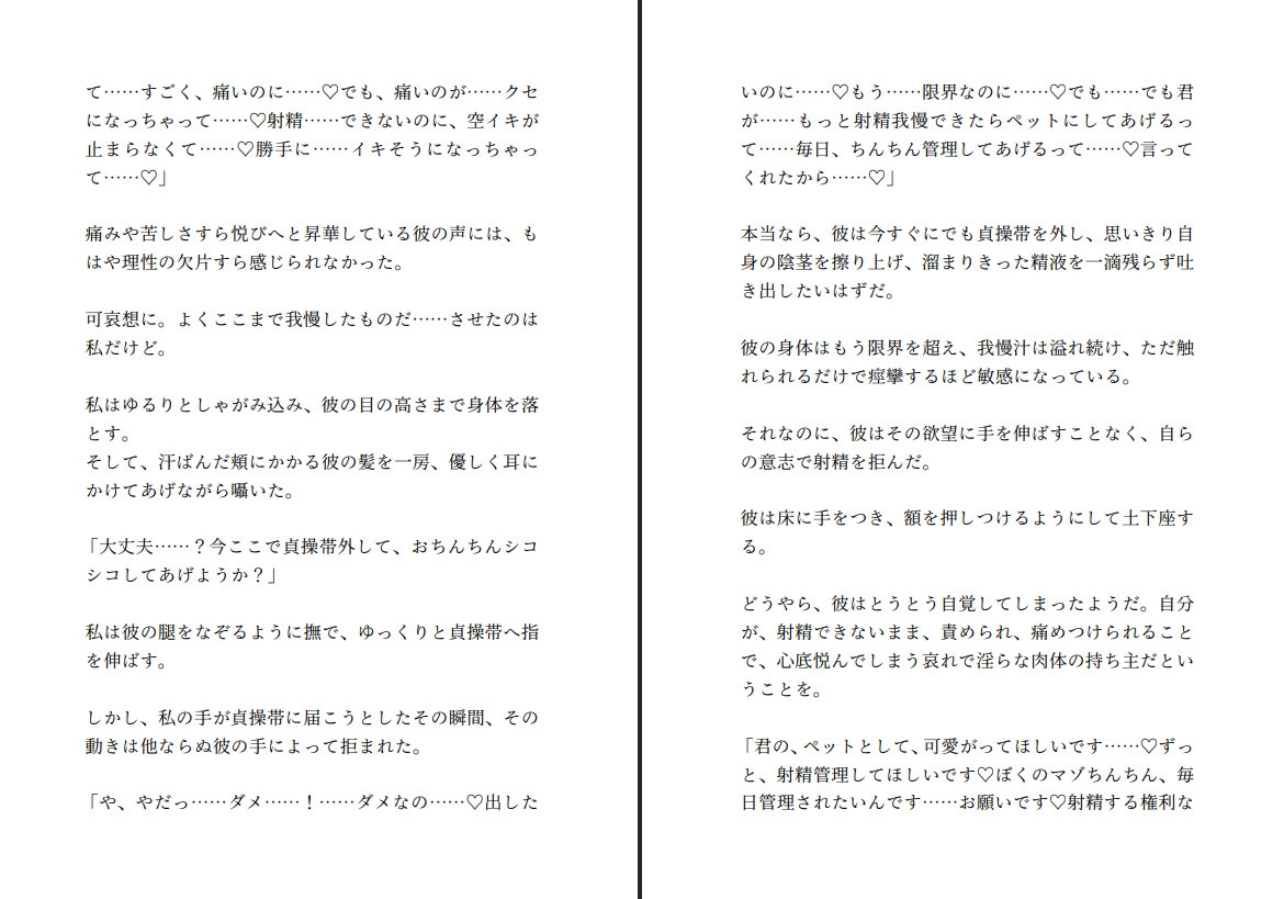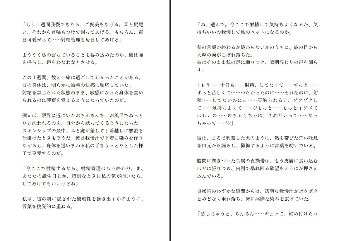 「気づいたら、君に射精管理されてるって妄想するの、癖になってて……」「えっ、射精管理、シてくれるの?」「ぼくのマゾちんちん、毎日管理されたいんです……お願いです♡射精する権利なんて、いりません……♡触ることも、勃つことも、精液を出すことも、全部君の許可がなきゃ、できない身体にしてほしいです♡」「イ、イく♡に、にんげんのときに、ためた、せーえき、犬のおしっこ用シーツに、ぜ、ぜんぶ、でるっ♡」