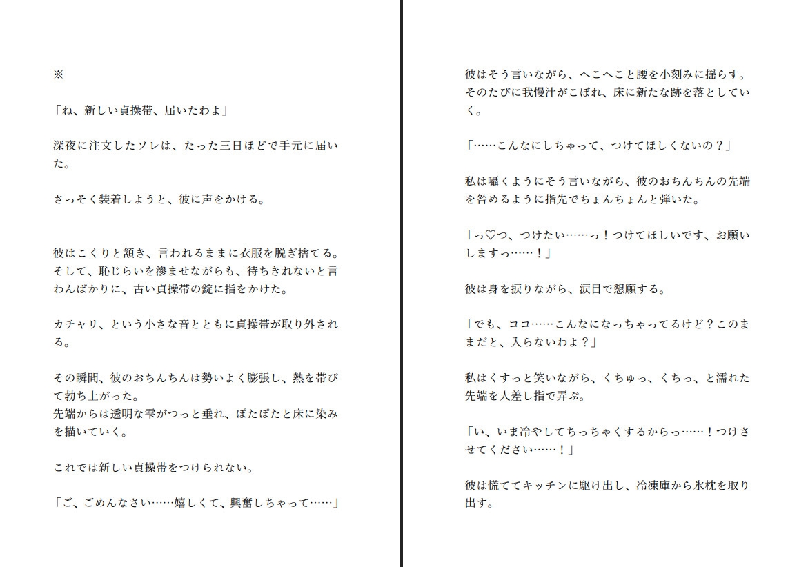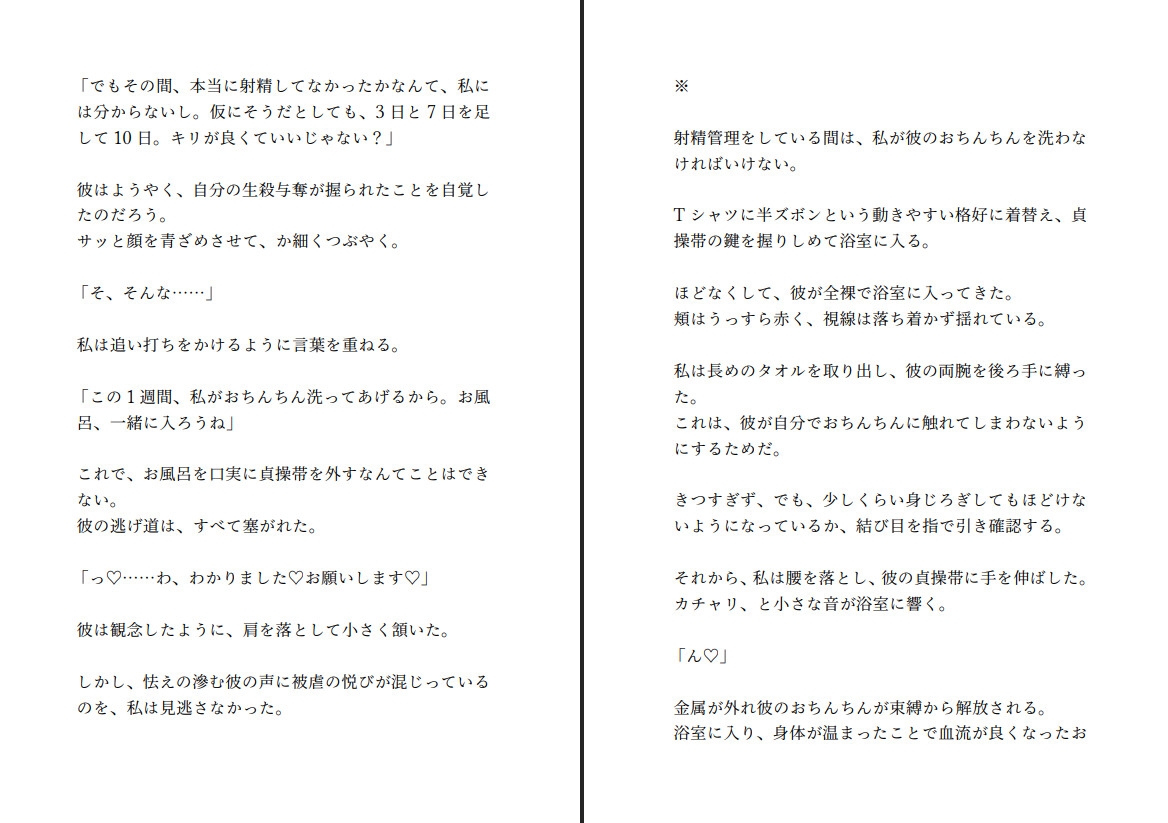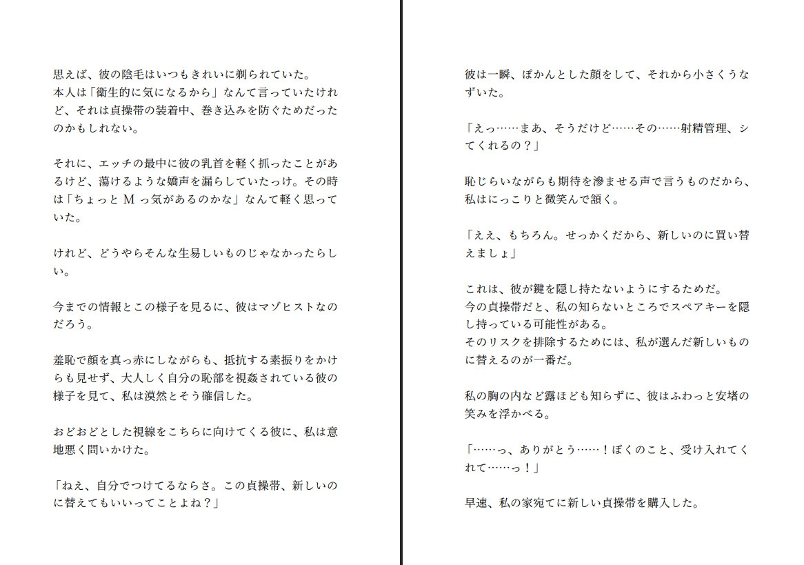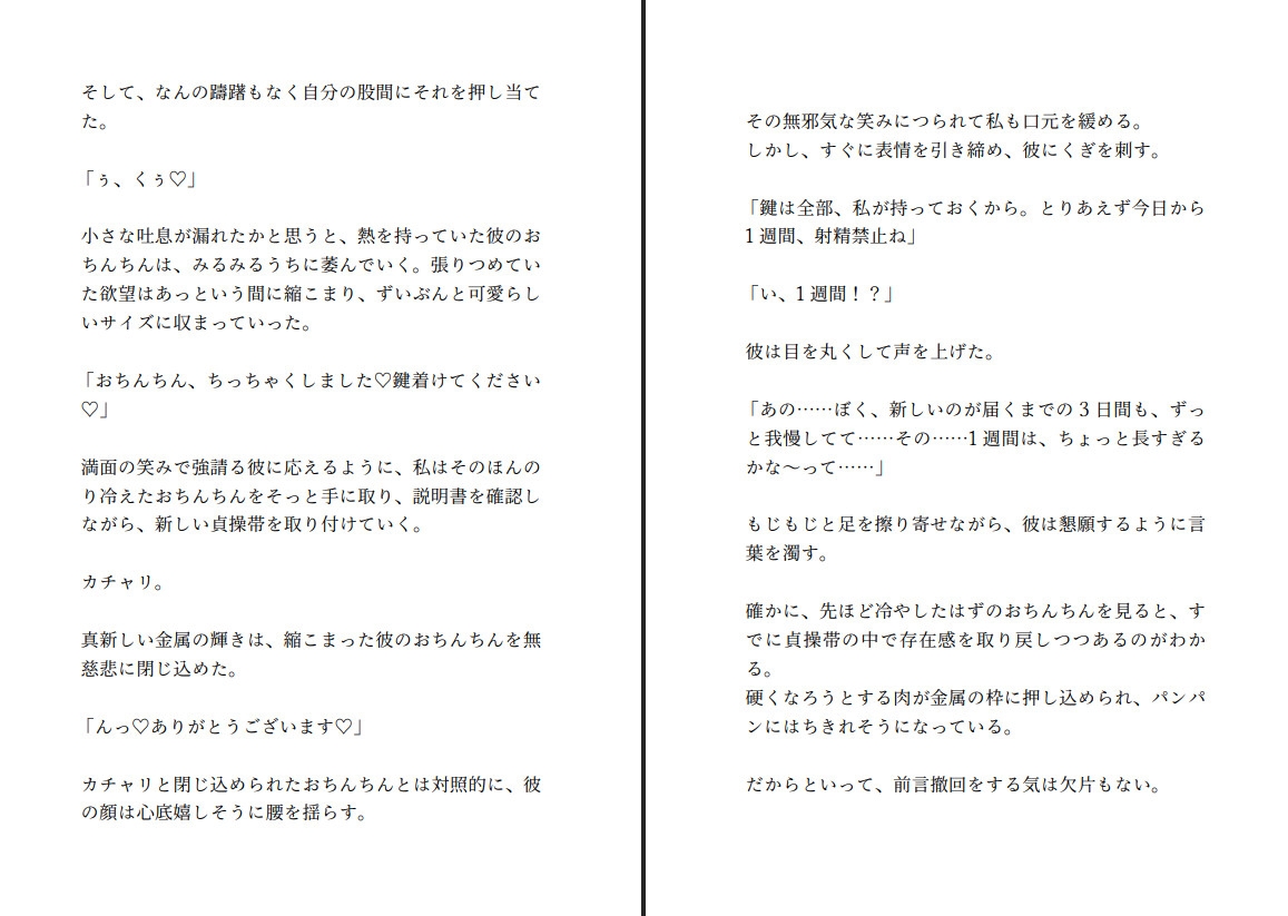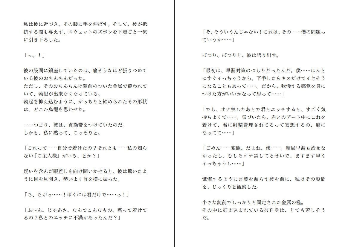 セルフ射精管理がバレて、新しい貞操帯つけられた彼氏君が、マゾ犬調教されるお話です。「ね、選んで。今ここで射精して気持ちよくなるか、気持ちいいの我慢して私のペットになるのか」