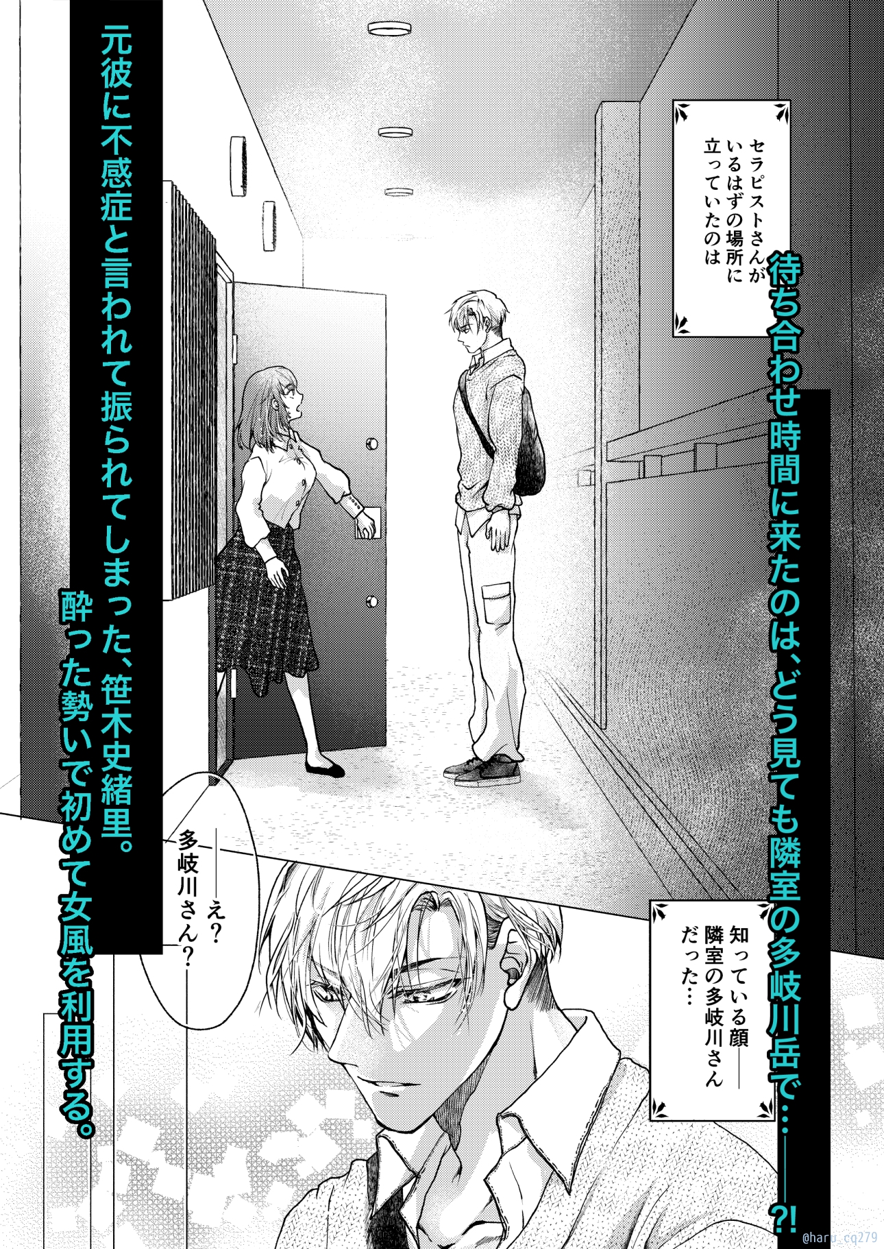 意気込んでドアを開けると、そこに立っていたセラピストはまさかの……隣人の多岐川 岳で──?!