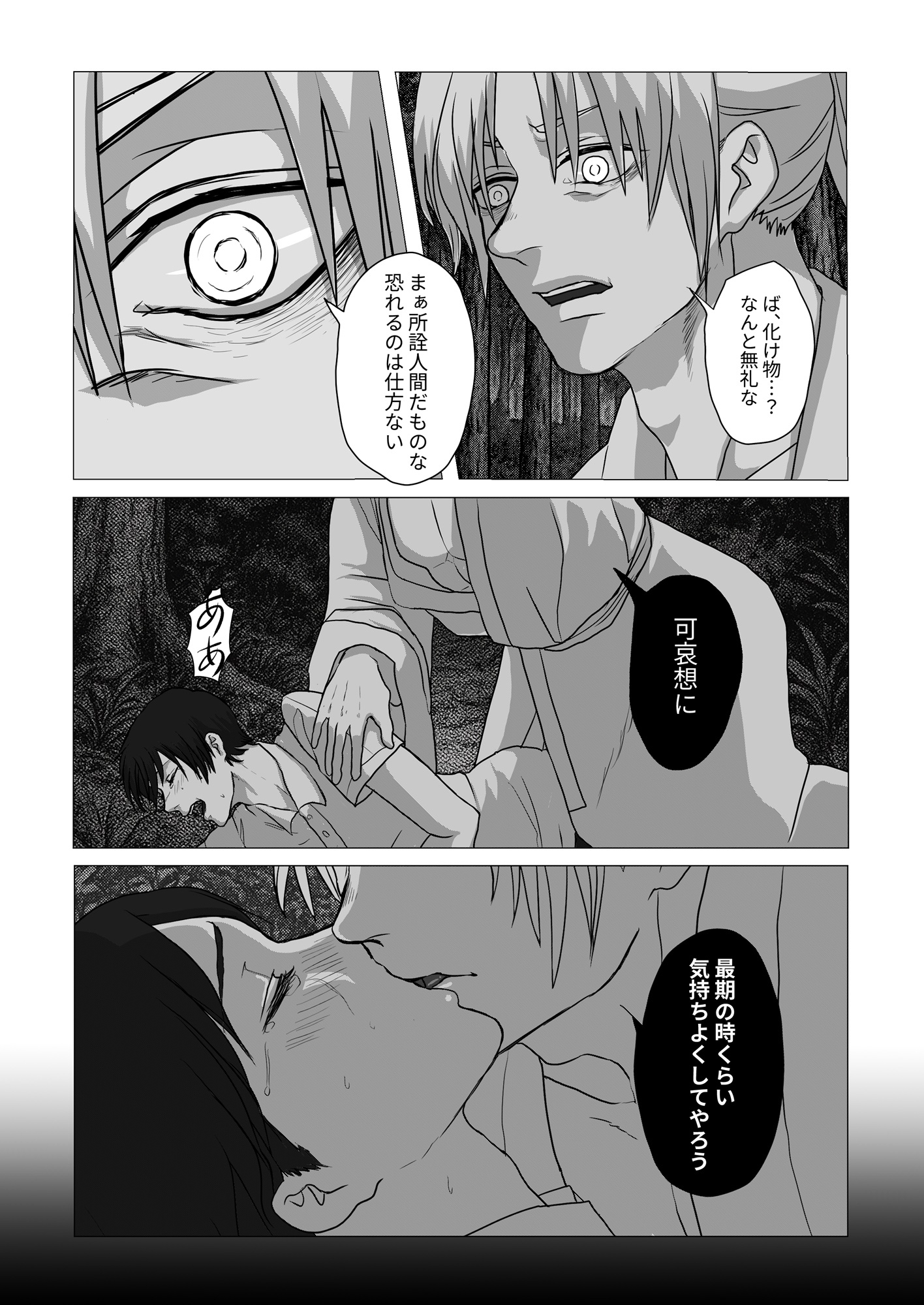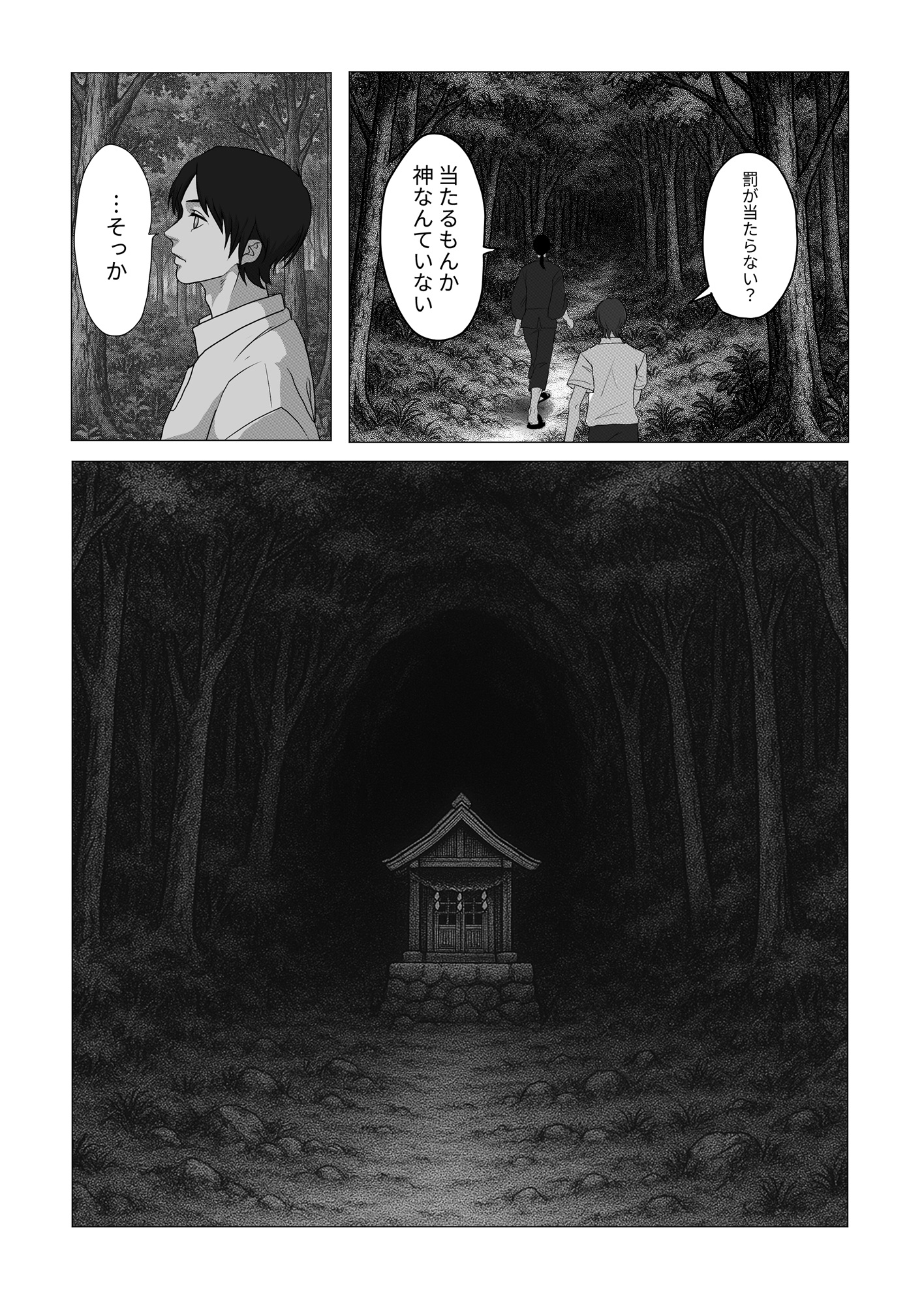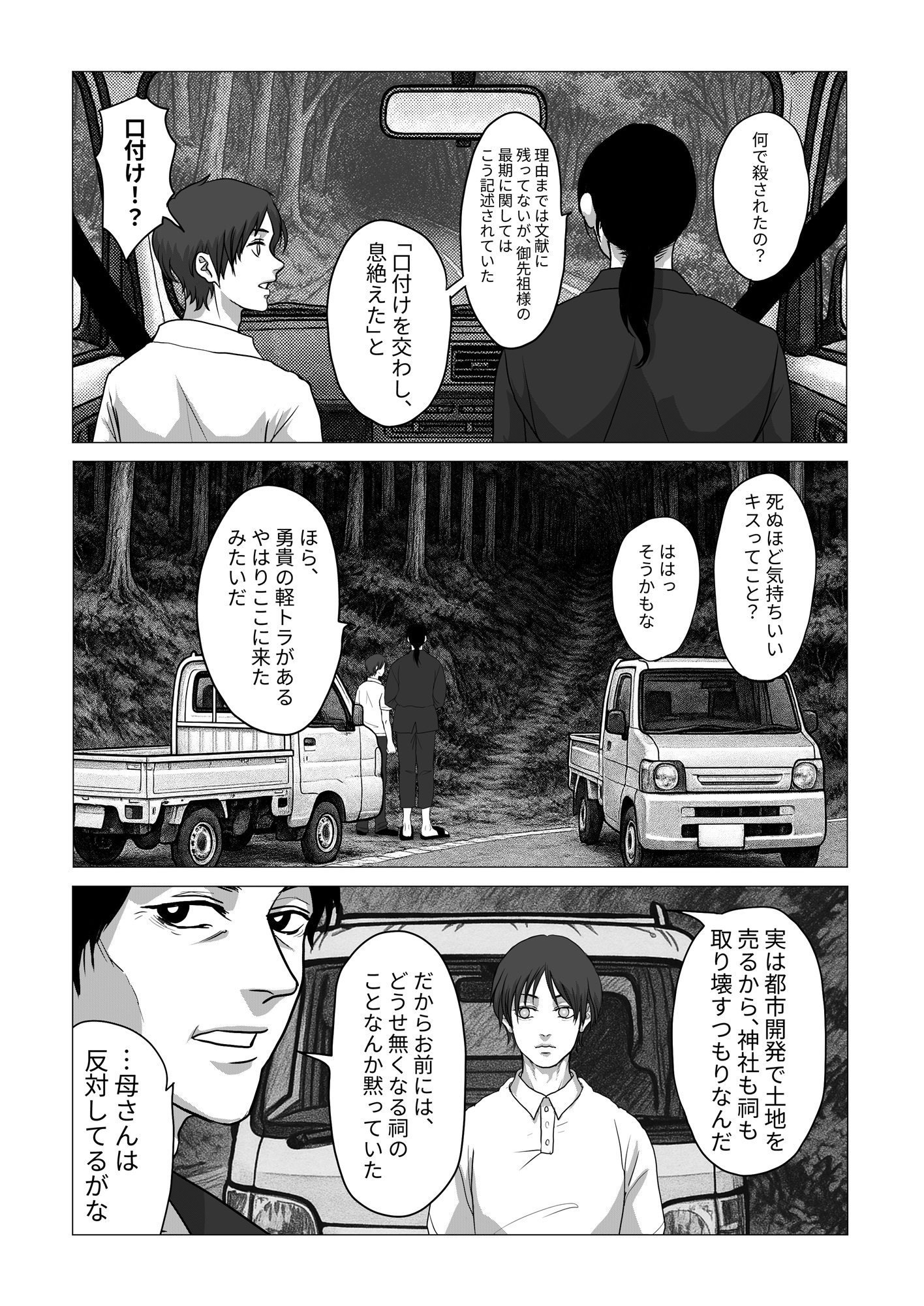 父親と叔父は神社と祠が建つ土地を売り金儲けしようと企んでおり、怒った神は父親と叔父に口付けて瞬く間に生気を吸い取り、命を奪う。逃げる青年を神は捕らえて蹂躙するー恐怖と快楽に青年は堕ちていく。