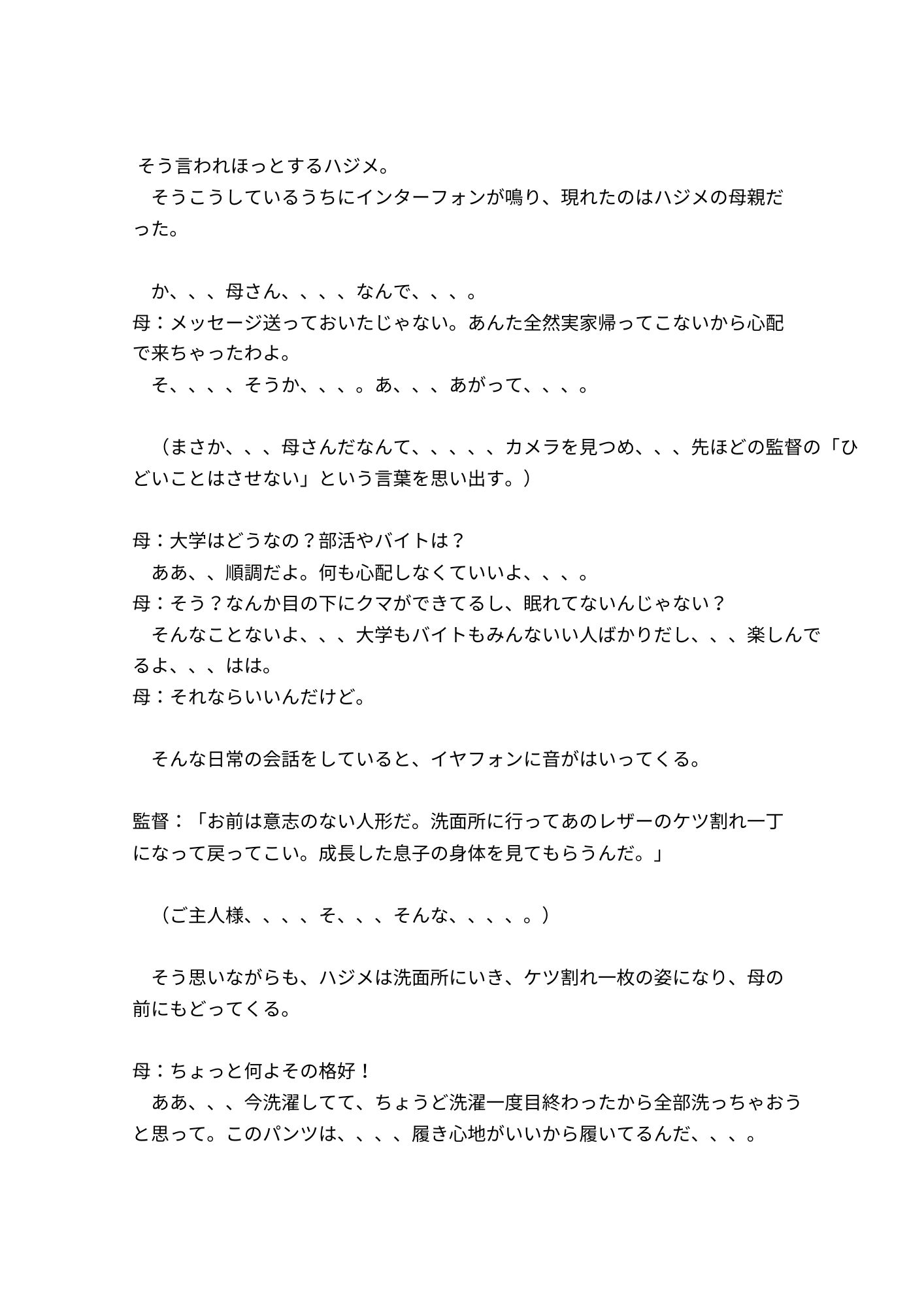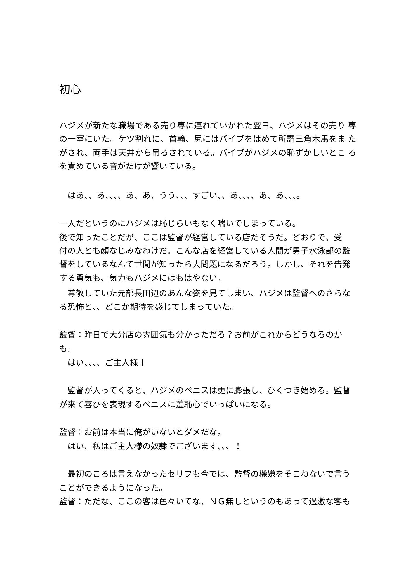 ハジメは撮られた写真や動画で脅されながら、後輩の橋本や羽田、親友の米田の前で奴○としてさらされたり、SMバーでのバイトの強要、知らない男たちに輪○され、おとされていった。