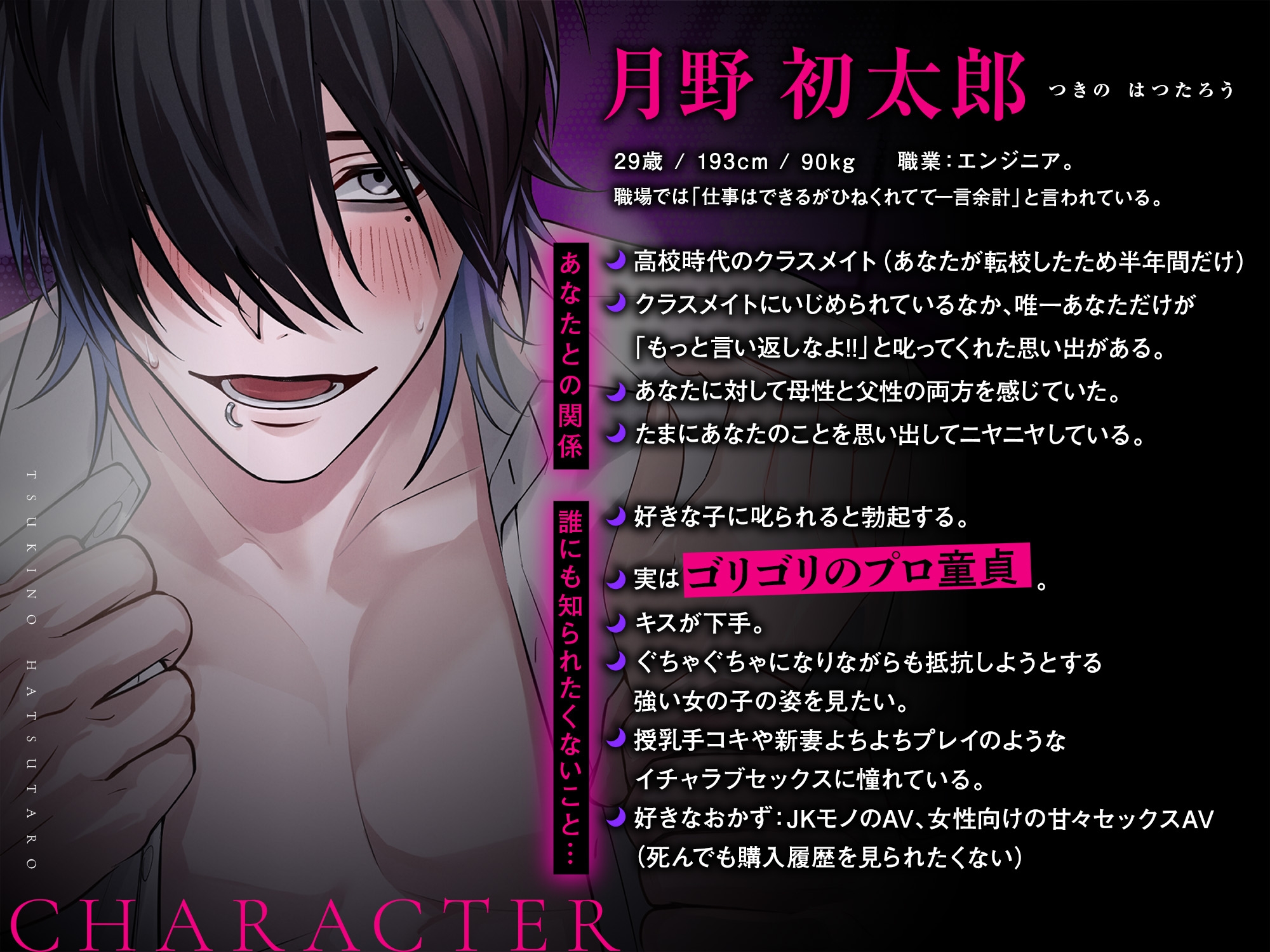 でっっっっか陰キャの初太郎くん。いつも一言余計でいじめられ体質。まさかキミにまた会えるなんて…。キミに叱られると勃起するほど嬉しいよ。だってそれって僕への愛情でしょう…?好き好き大好き。こんな僕がキミとえっちしちゃってごめんね…♡♡