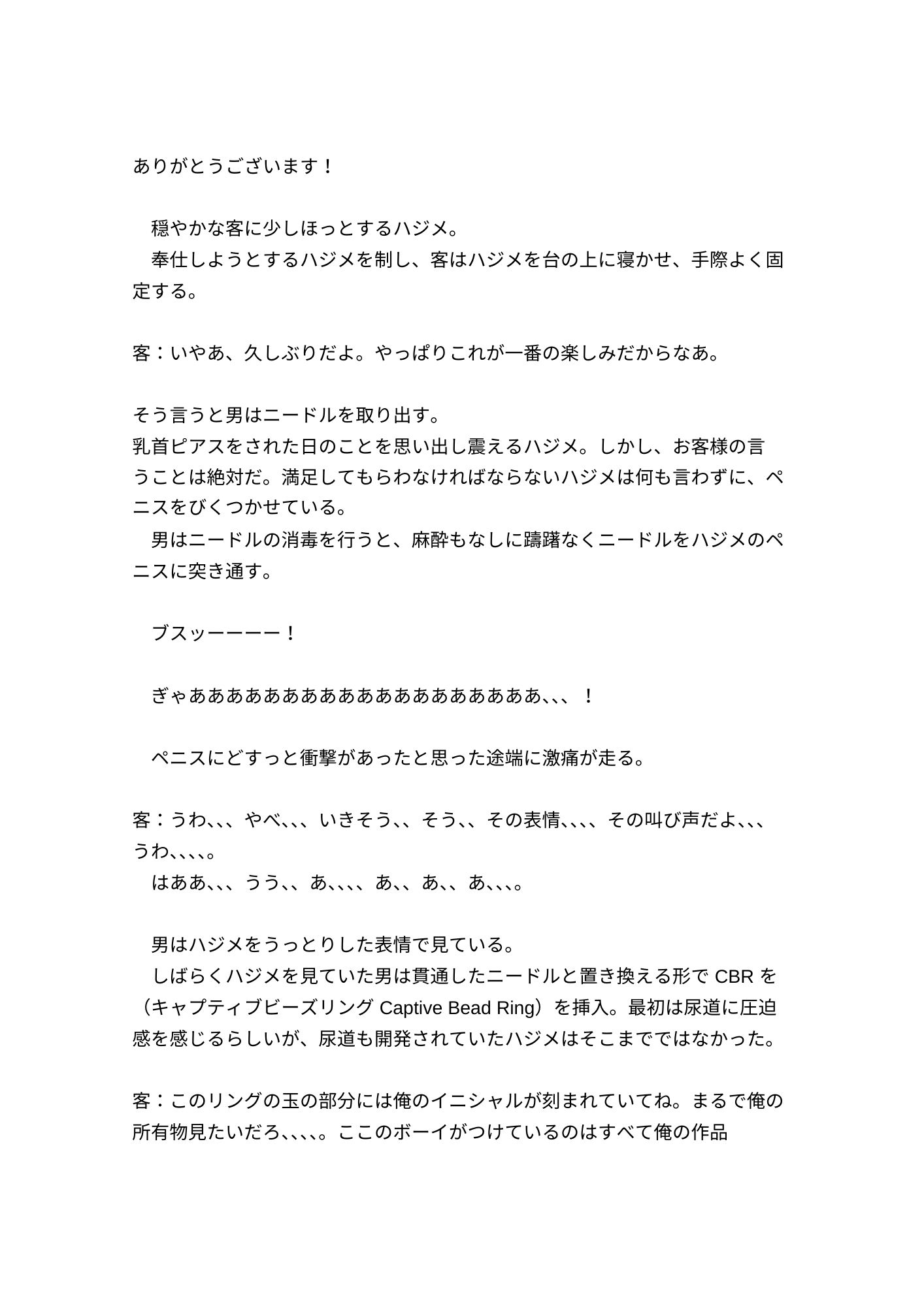 SMバーのバイトを辞めさせられたかと思えば、次は売り専のバイトを強○され、売り専バイトの研修と称し乳首ピアスをあけられ、絵具によるメッシープレイをさせられ、精神的調教のため公衆の面前での過激な露出、母の前での晒し等さらに追い詰められていったハジメ。