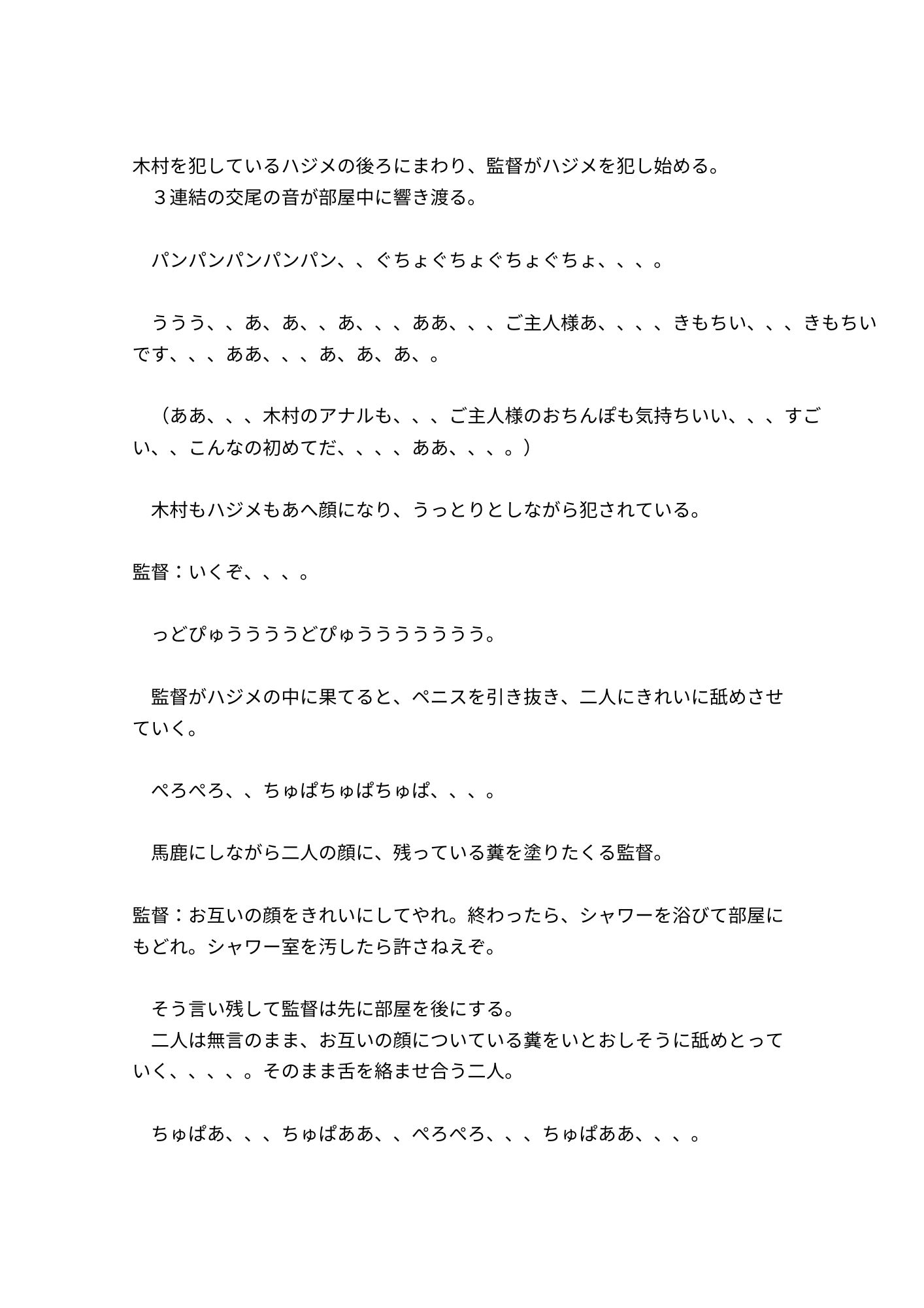 ノンケ水泳部部長が対立していた監督、後輩、SMバーのマスターに弱みを握られて脅されながら調教されていくお話です。5巻はスカトロ、フィスト等の過激要素も含んでいます。16000字程度。