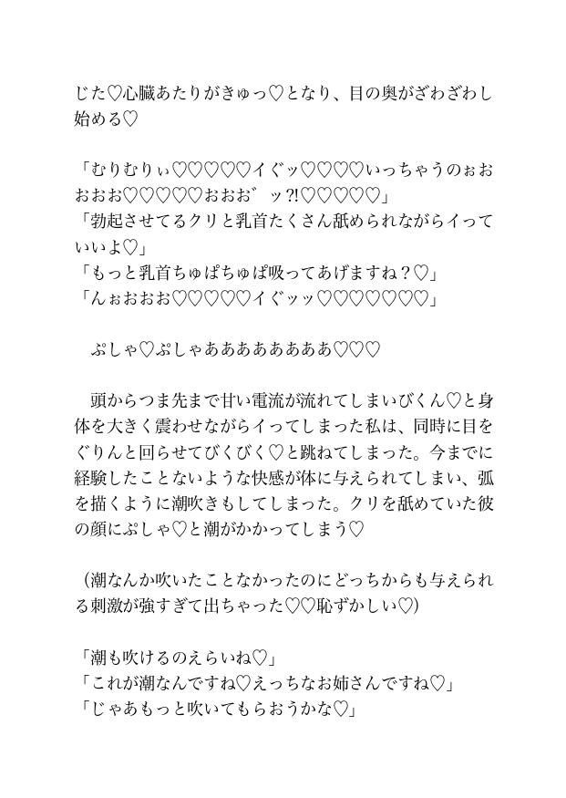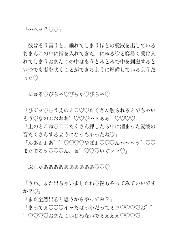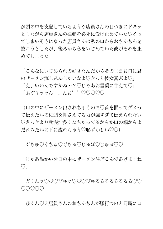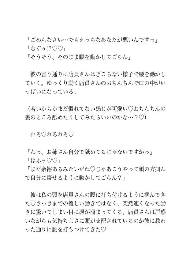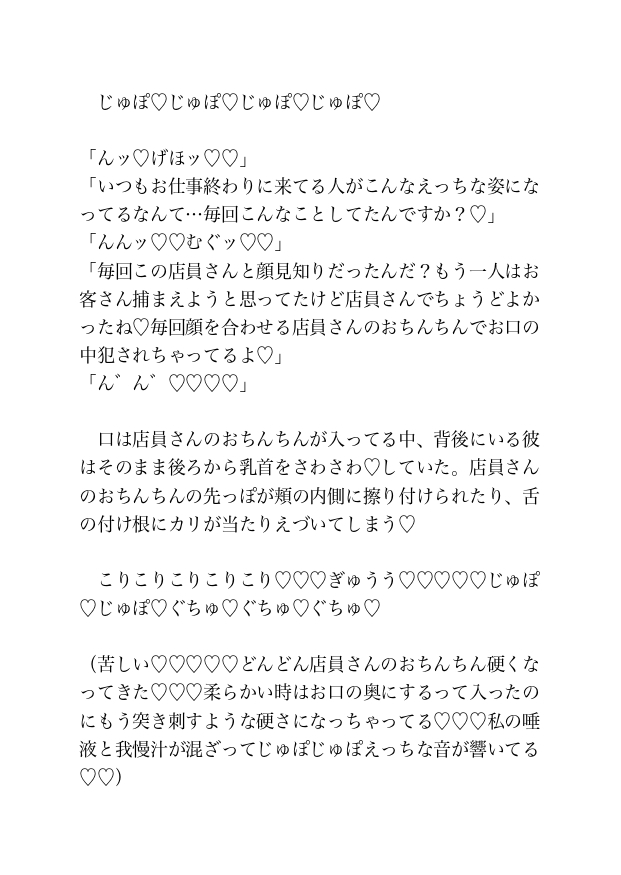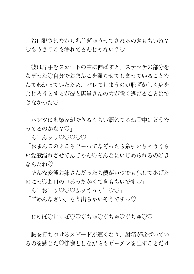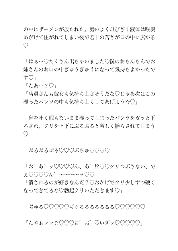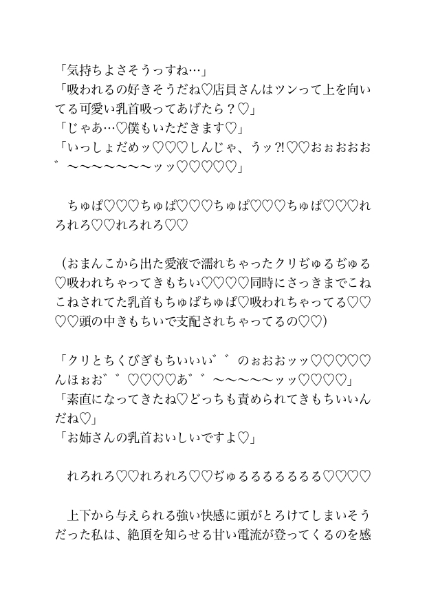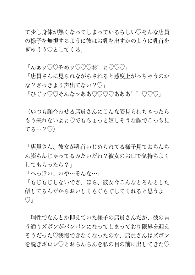 個室に戻ると先ほど消したと思っていたえっちな動画が流れっぱなしになっており、さっき漫画を取ってくれたお兄さんにもバレてしまっていた。主人公は流れてしまっていたえっちな動画の通りに身体を触られてしまい、お兄さんが呼んだもう1人の人にえっちな姿を見られてしまうがそれが最初に受付をしてくれた店員さんで、2人からいじめられてしまう。文字数:12618字