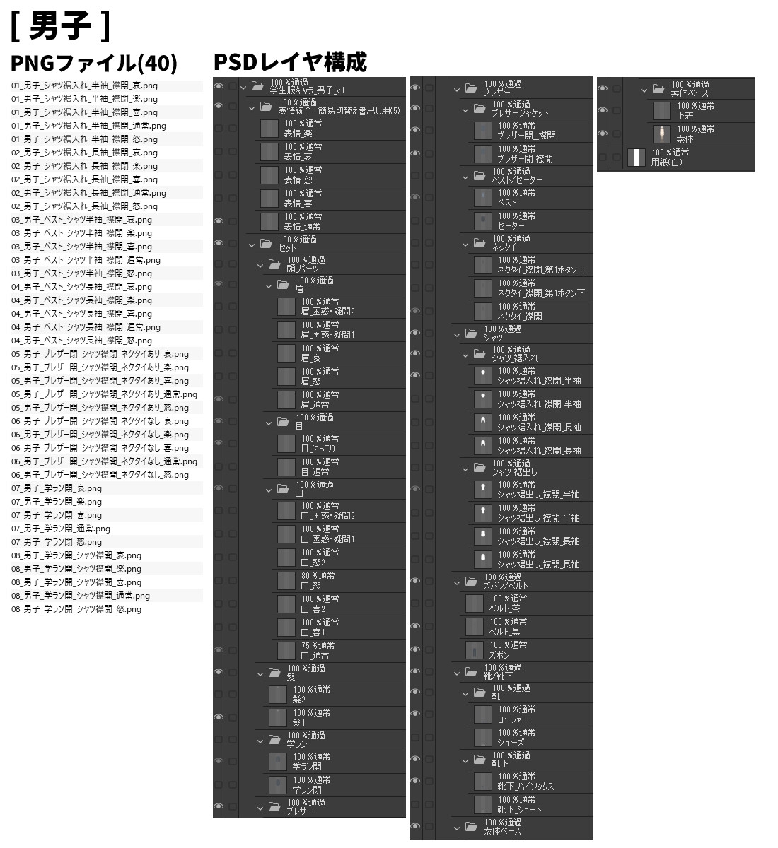 ・PNGは各キャラ40枚(1ポーズ・衣装8種・5表情差分)。