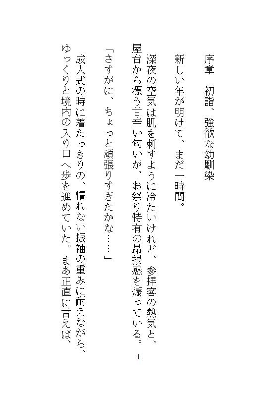 新年を機に勇気を出して振袖を着込んだ私。颯大のことがずっと好きだった。だが、幼馴染の距離感に甘えて一歩踏み出せずにいた。帯で締め付けられた身体で彼に翻弄され、初めて知る女としての悦びに溺れていく。
