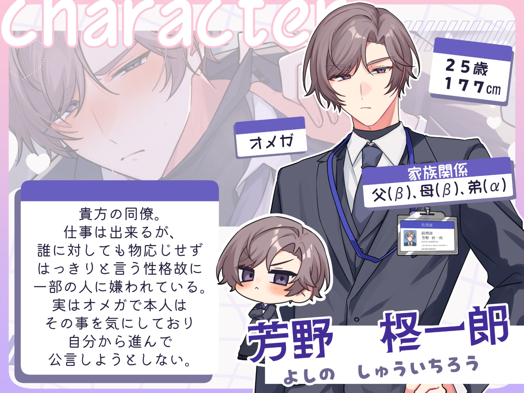 【オメガバース×男性受け】 貴方の隣の席には、少し苦手な同僚がいる。 彼、芳野柊一郎は誰に対してもはっきりとした物言いをするせいか、他社員ともあまり仲が良くなく、冷たい人間だと言われていた。そんなある日、貴方が押し付けられた仕事を片付けようとしていた時、柊一郎の方から声を掛けられ手伝うとの申し出が…!?