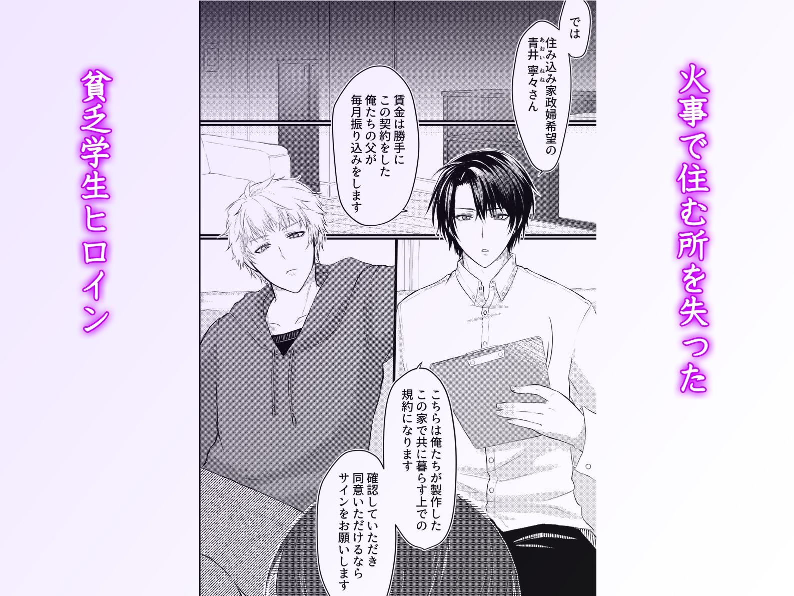 リビングで双子の律と湊から冷たい視線とともに契約書を突きつけられる。