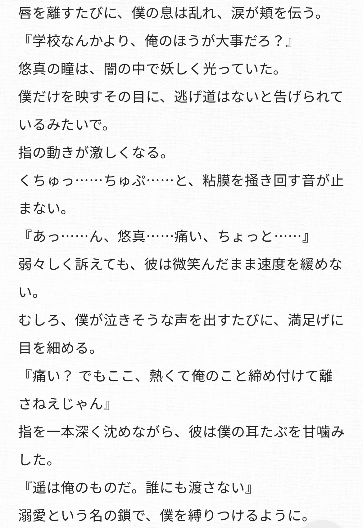 悠真による、息が詰まるほど濃厚な束縛。家族という名の檻の中で、少しずつ感覚を狂わされていく遥の危うい姿にドキドキが止まりません。