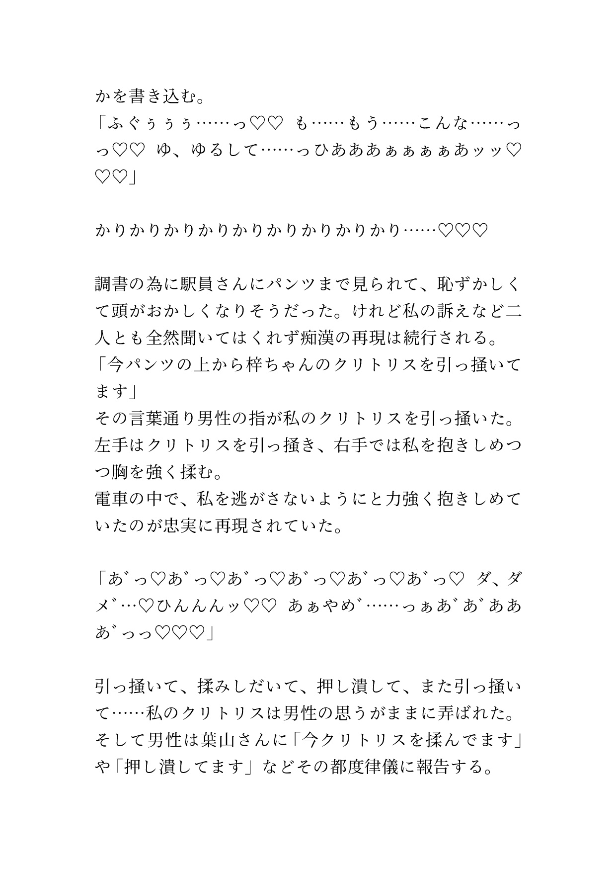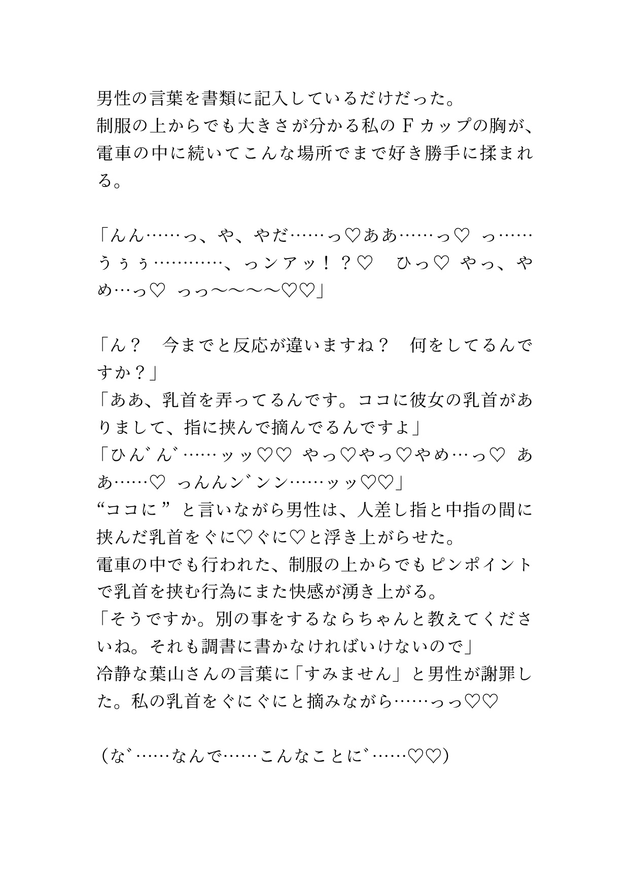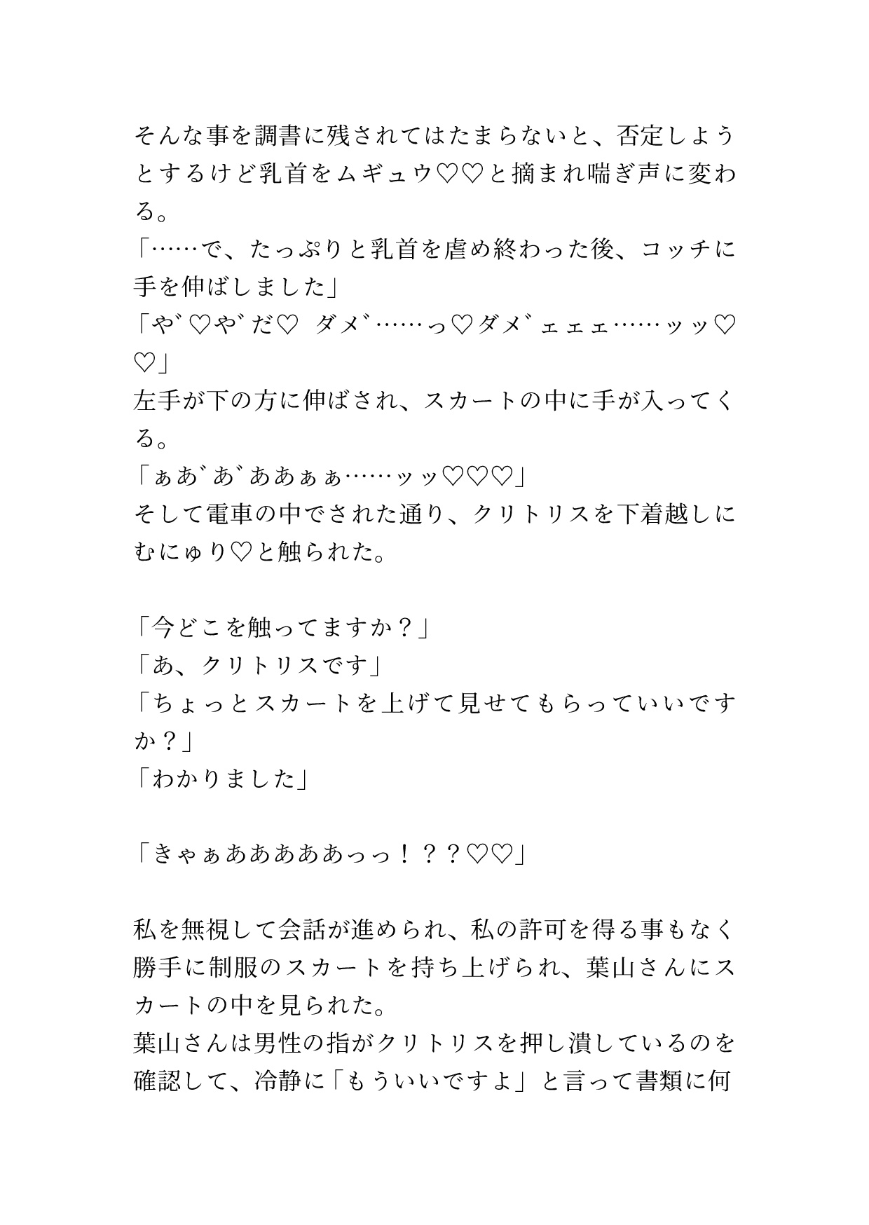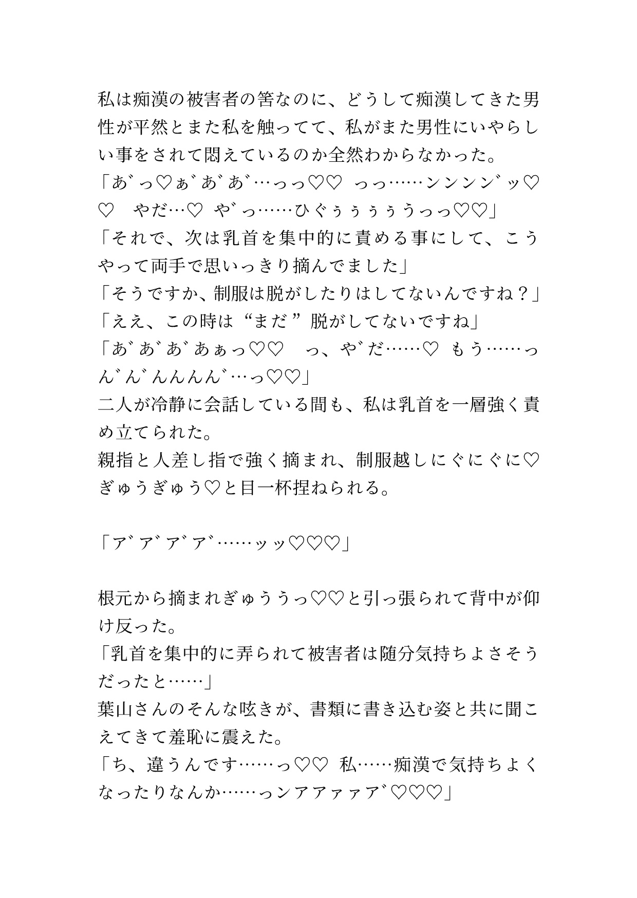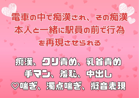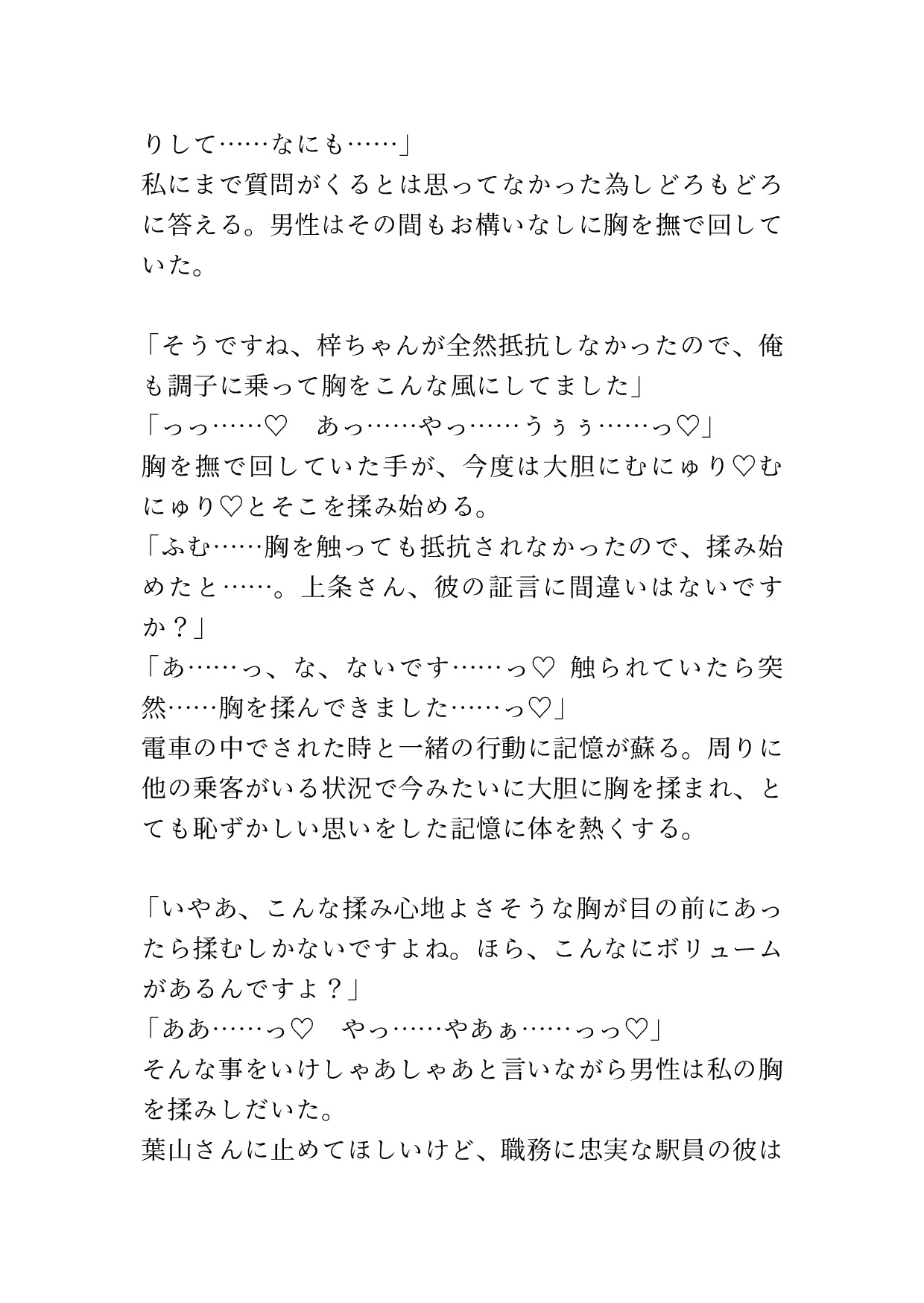 痴○の被害者として取り調べに同席していたら、駅員にどんな事をされたのか再現してくれと言われ、痴○本人と一緒に電車の中でされた行為を駅事務室で再現する話です。 駅員の前で胸を揉まれたりクリ責めされたりイかされたりと色々されてます。