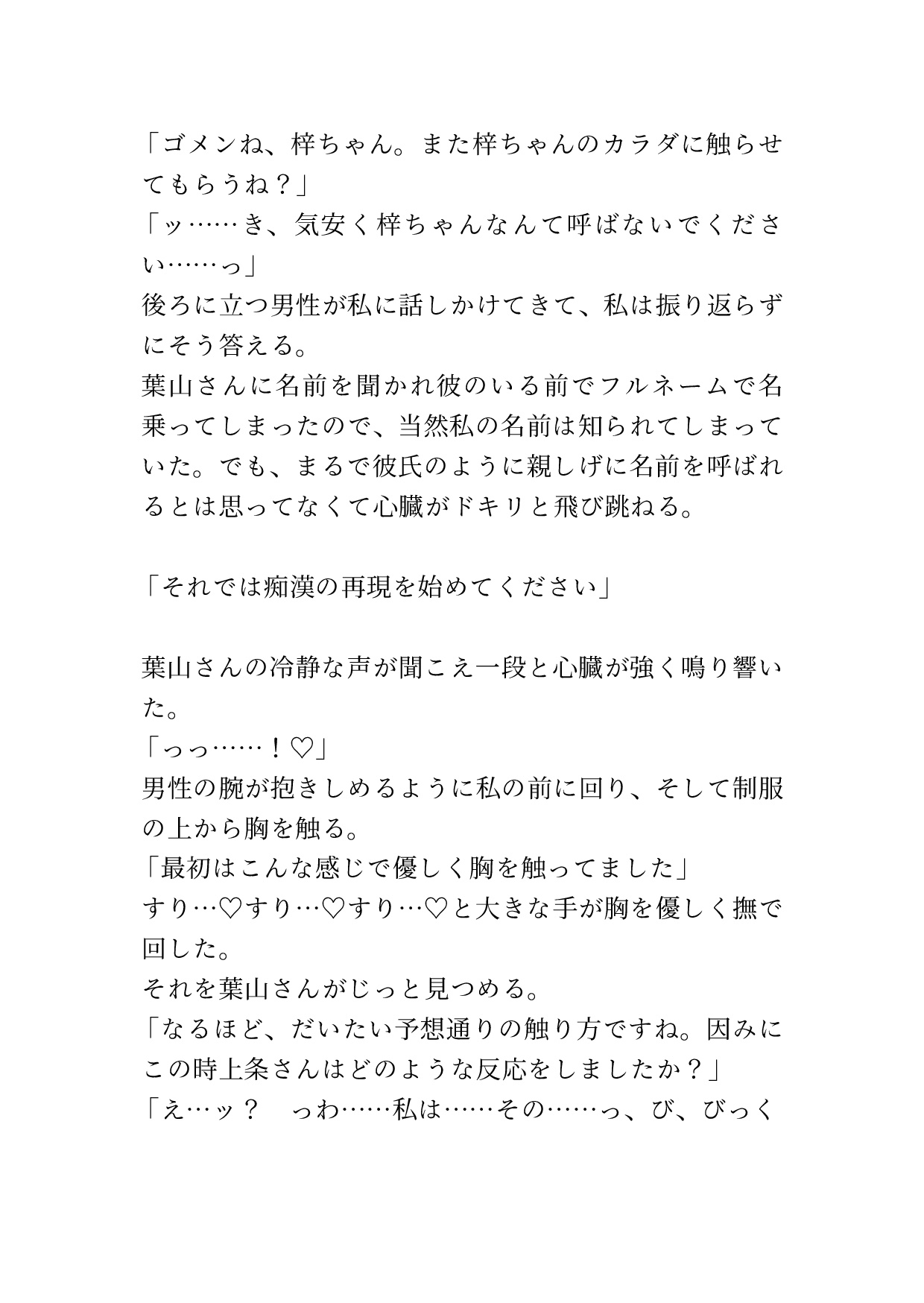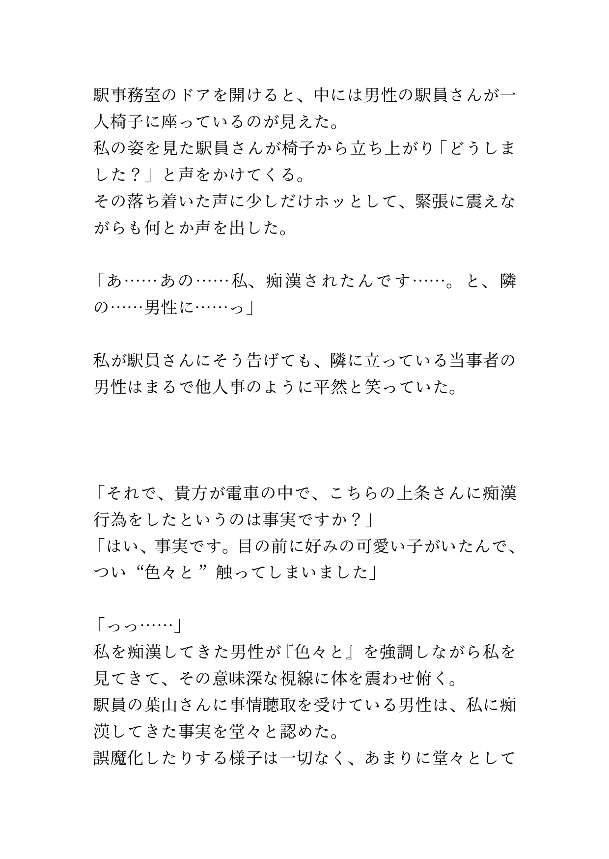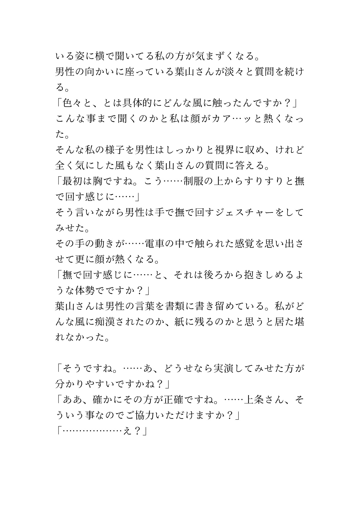 痴○の被害者として取り調べに同席していたら、駅員にどんな事をされたのか再現してくれと言われ、痴○本人と一緒に電車の中でされた行為を駅事務室で再現する話です。