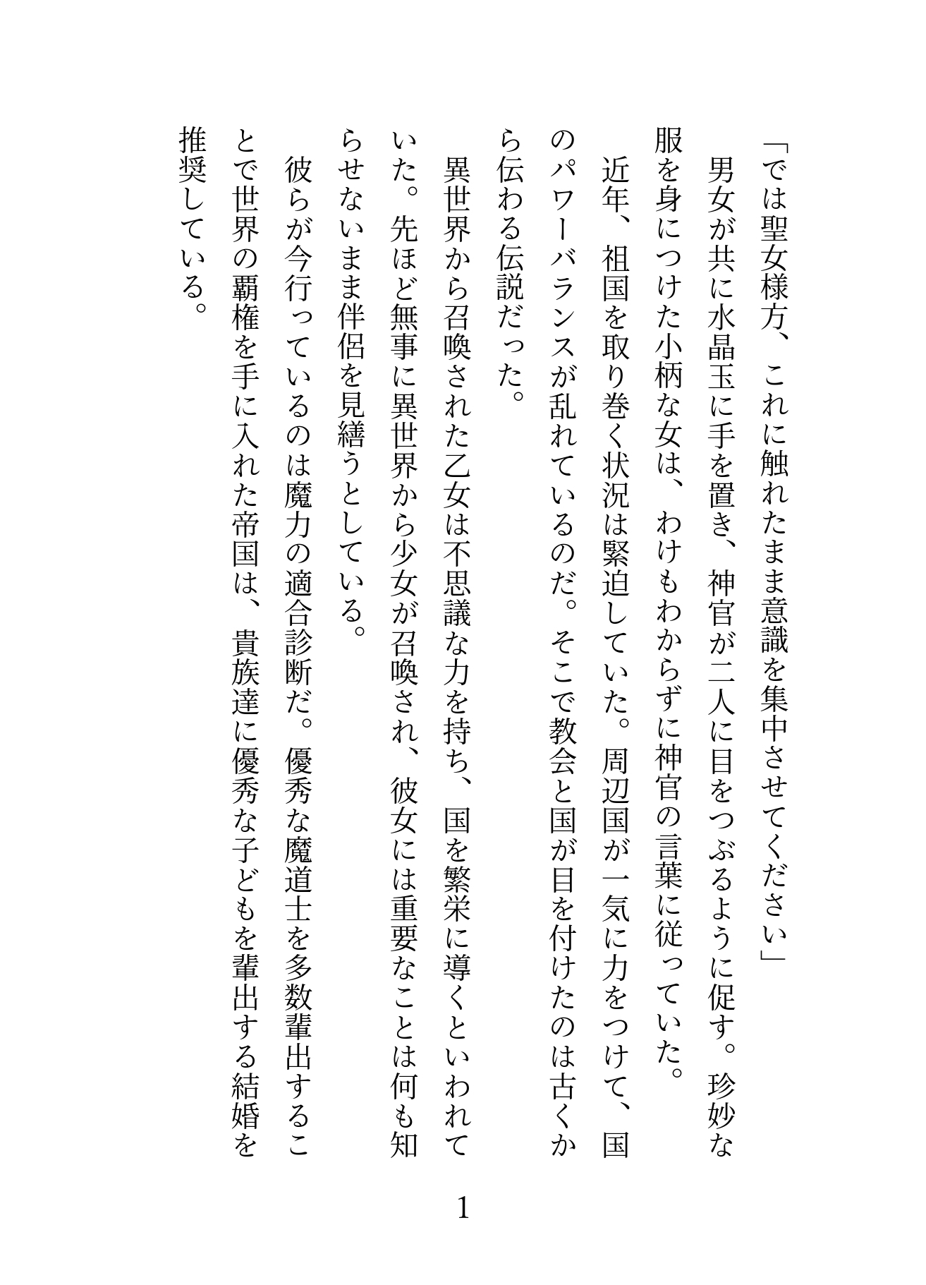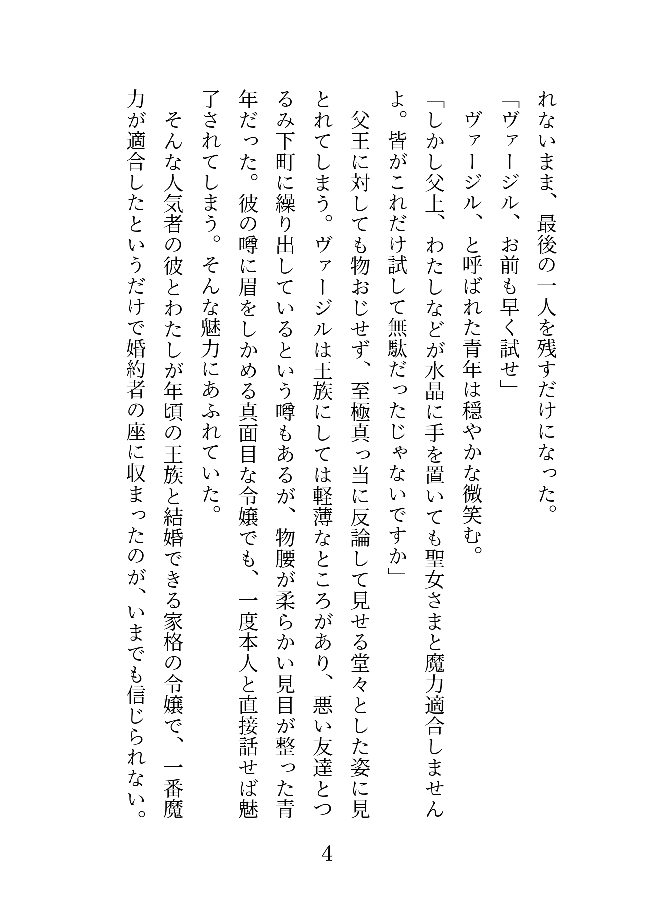 優秀な魔術師を輩出するために男女の魔力の相性を水晶玉で判定し魔力が適合した男女の結婚を推奨する帝国。マジメだがあまり自分に自信のない令嬢のシャーリーは、王家と家格の釣り合う令嬢のなかで一番魔力が適合したという理由で、王子ヴァージルの婚約者に選ばれた。