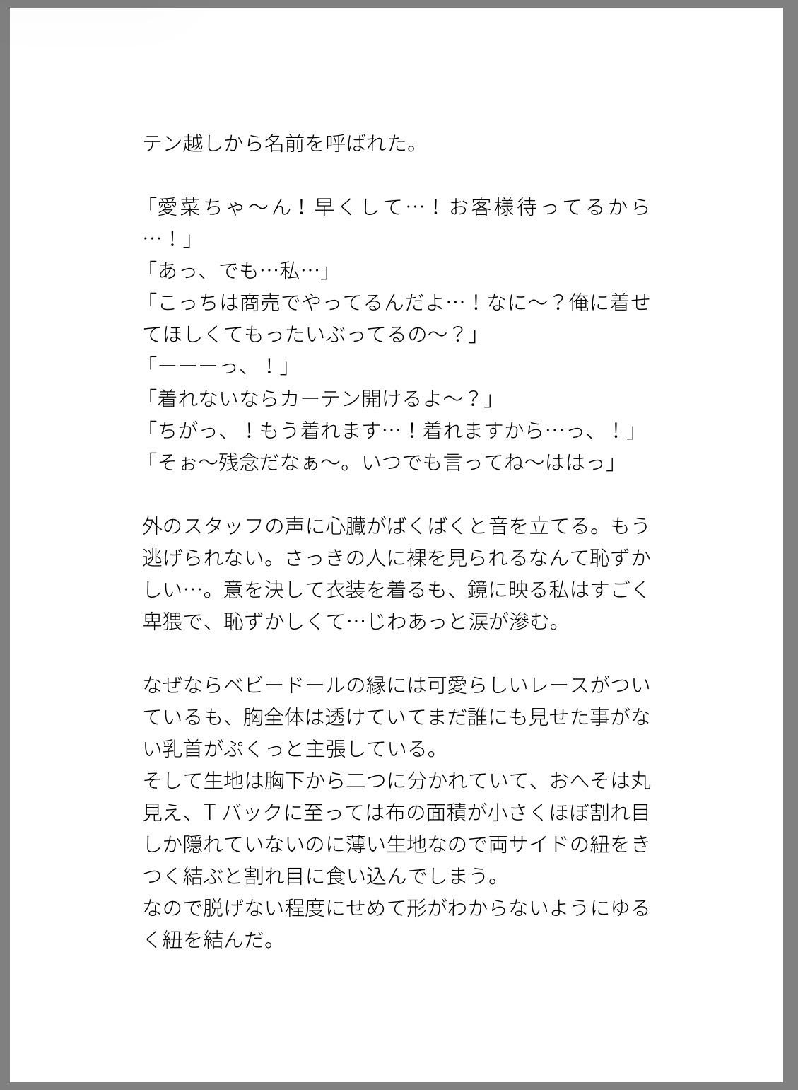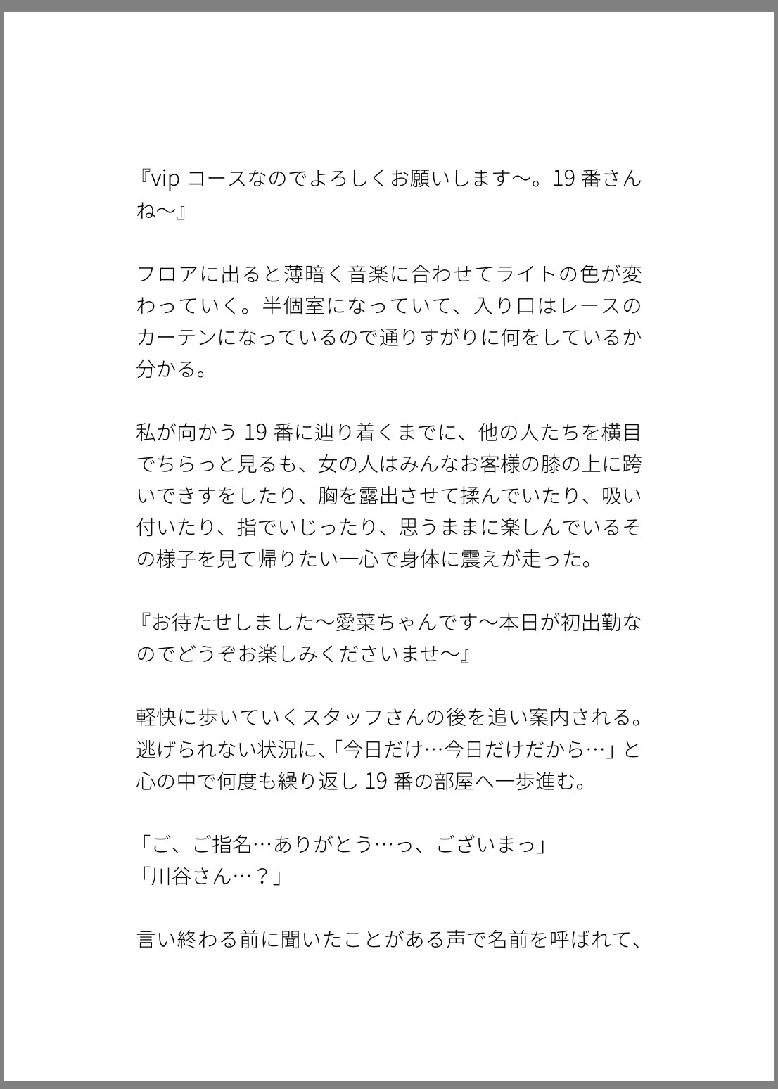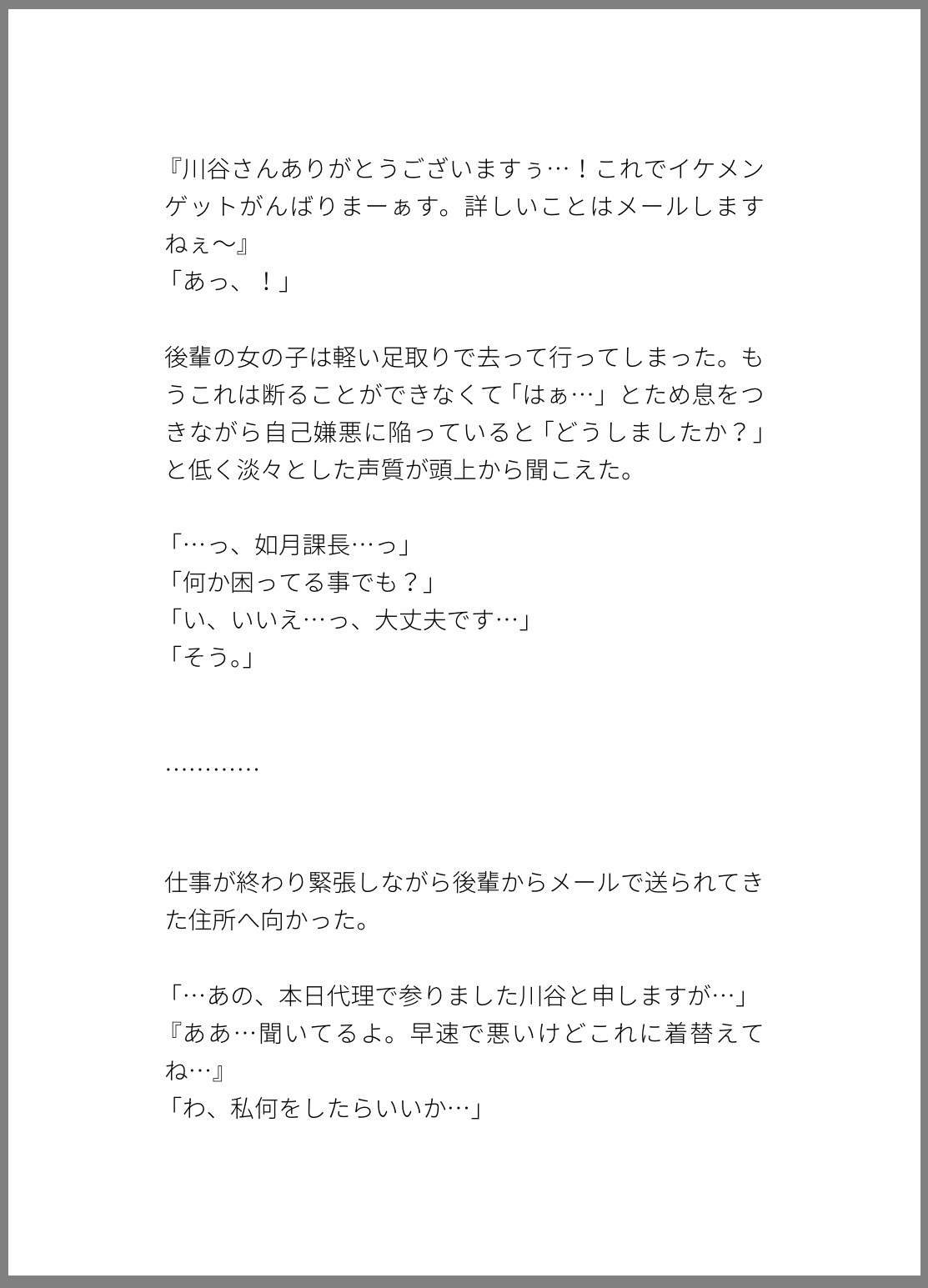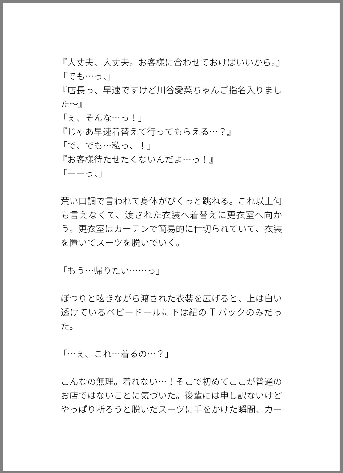 会社の後輩に頼まれて1日だけおっぱぶで働くことになり、いざお店に出ると課長から指名が入っておっぱぶだからという理由で好き勝手に乳首イキされて、おっぱぶは生ハメ禁止なのにそれを知らない無知主人公はサービスタイムと生じて中出しまでされる話。