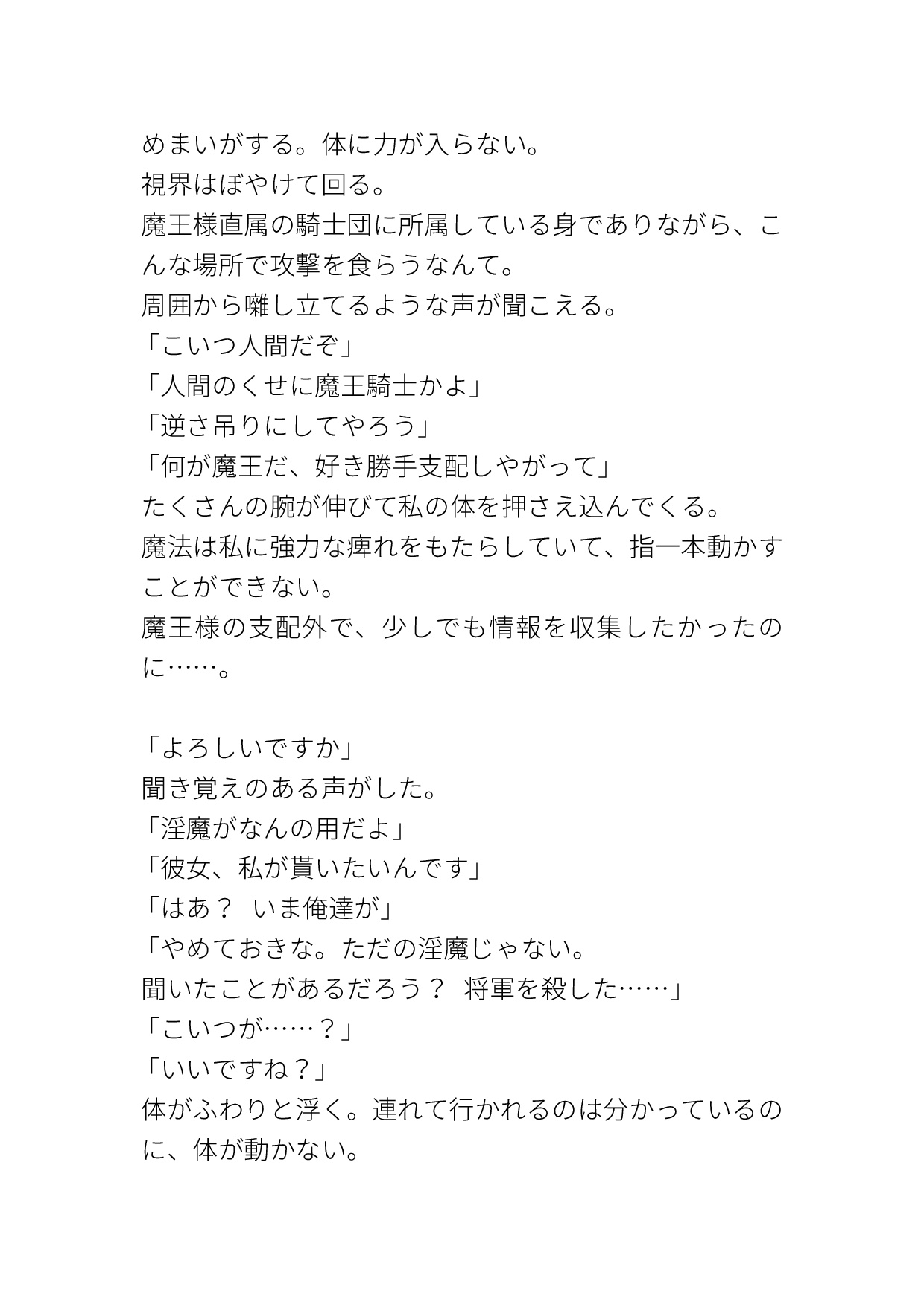 ある日魔王軍の騎士であるユエが油断し襲われているところを、何故か敵の淫魔であるサイラが助けてくれる。
