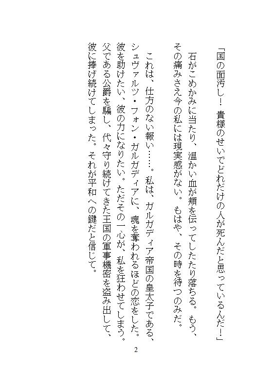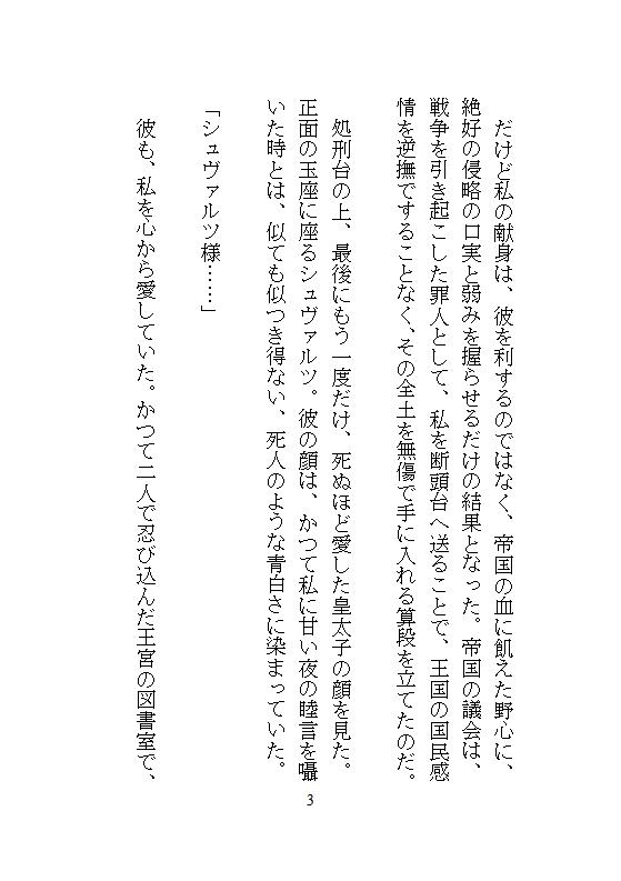 聖アルカディア王国の公爵令嬢ルーデリアは、敵国ガルガディア帝国の皇太子シュヴァルツを愛した末に、売国奴の毒婦として断頭台で処刑された。 しかし、死の瞬間に耳にしたのは、狂気に染まった彼の絶叫。目覚めると、そこは十九歳の春。二度目の人生のやり直しの世界だった。