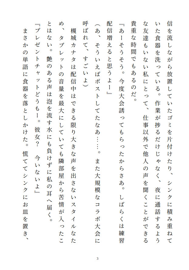 どこにでもいる一般的な独身OL。人気配信者、槻城カナタを推している。