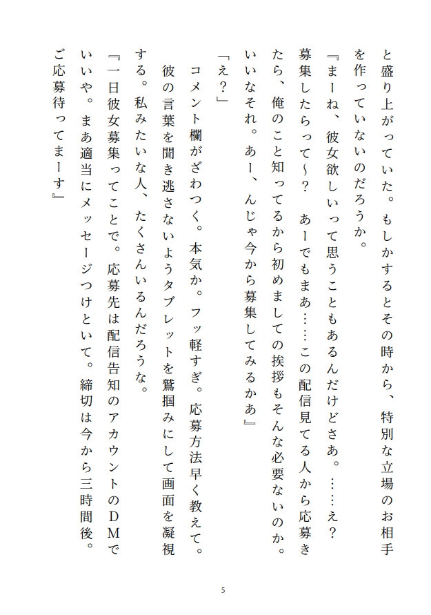 ずっと推してた配信者が、一日彼女を募集すると言い出した。選ばれないと思ってたのに――私が彼の、一日彼女に選ばれた!