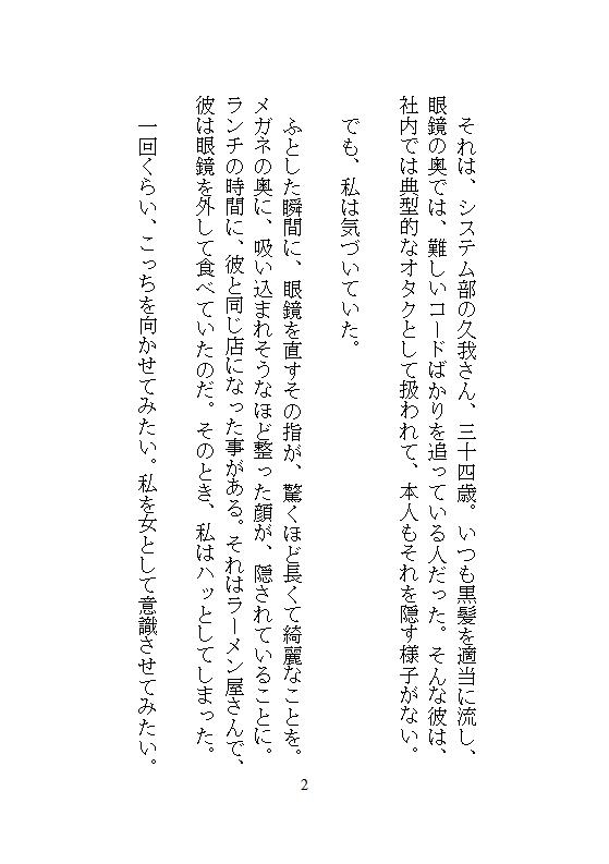 ある日、私が店番をしている会社直営の唐揚げ店でシステムエラーが発生。 駆けつけてくれた久我さんをからかおうと、悪戯心で見せた卑猥な動画。 無表情だった彼の耳がみるみる赤く染まり、作業着の股間が猛々しく膨らんでいく。狭いプレハブの店内で、私はカウンターに押し付けられた。外では車が行き交い、いつお客さんが来てもおかしくない状況。 それなのに、久我さんの長い指は……。
