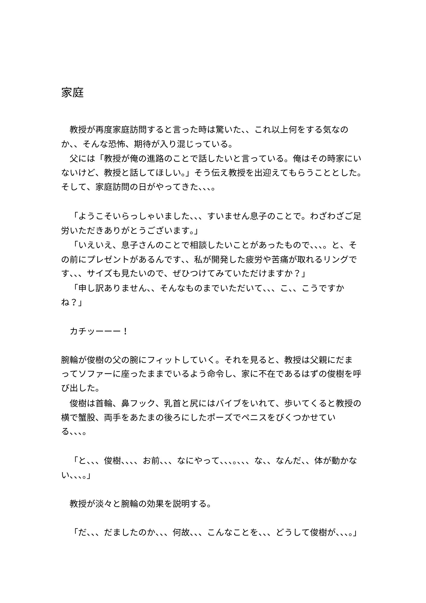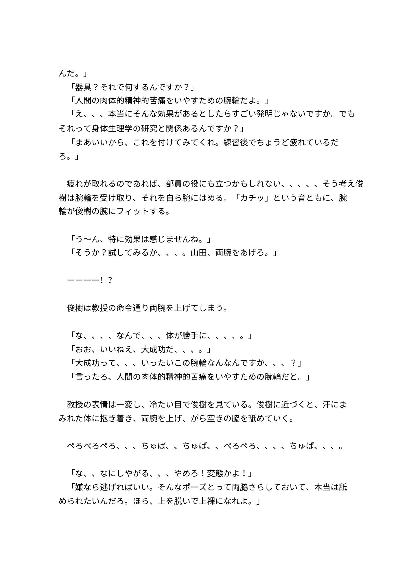 大学教授が人の体を操れる腕輪を使い、体育会学生を次々と餌食にしていくお話「従う理由」の番外編です。「従う理由」に登場した陸上部キャプテン山田俊樹を主人公として物語が展開していきます。父子相姦の描写があります、、、。
